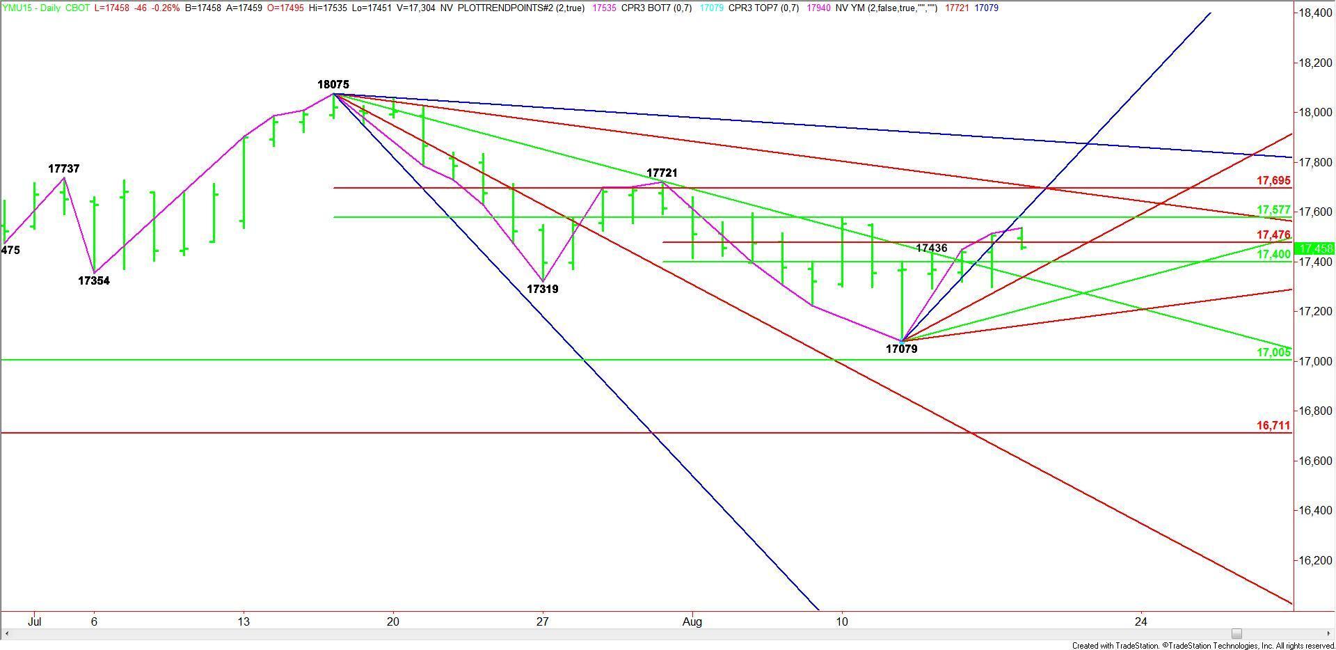The subsequent selling pressure put the Dow on the weak side of a short-term Fibonacci level at 17476. Trader reaction to this level will likely determine the direction of the market today.