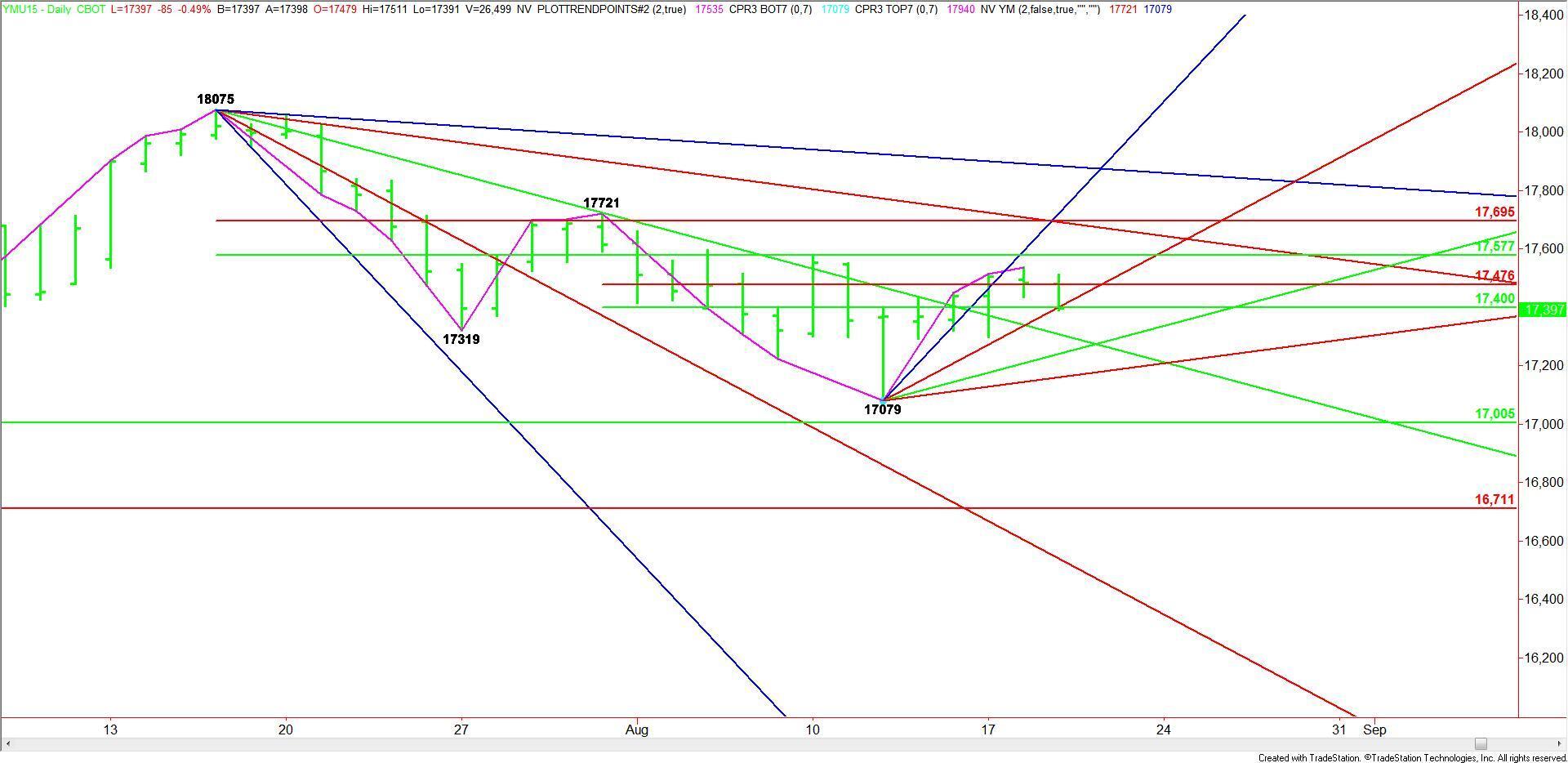 The main trend is down on the daily swing chart. The short-term range is 17721 to 17079. Its retracement zone at 17400 to 17476 is currently providing resistance.