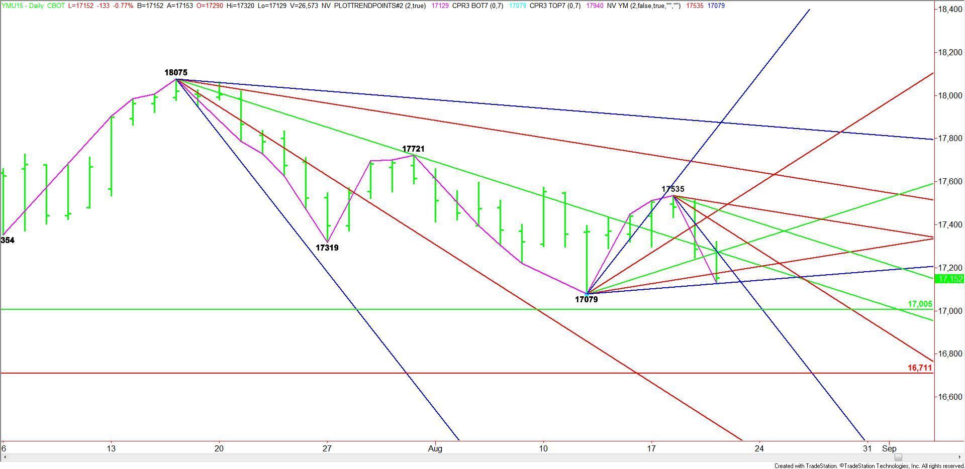 September E-mini Dow Jones Industrial Average futures are called lower based on the pre-market trade. The rapid sell-off yesterday and today has put the market in a position to challenge the main bottom at 17079. This could lead to a test of a major 50% level.