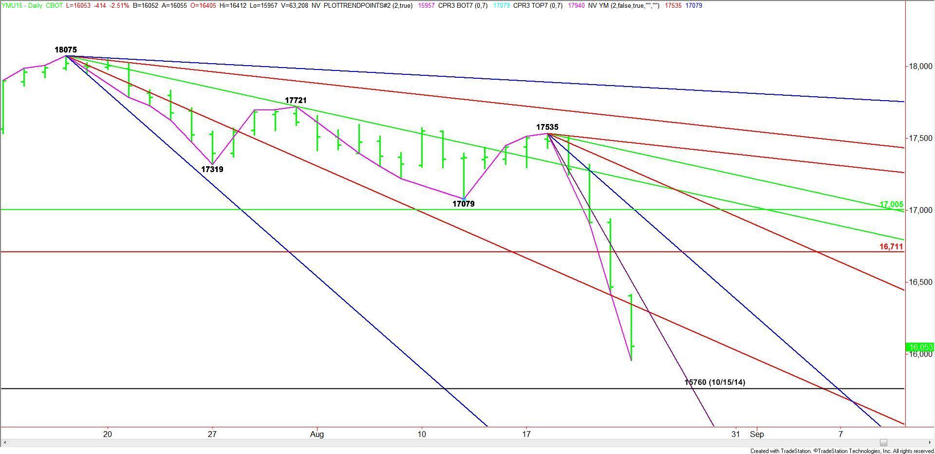 September E-mini Dow Jones Industrial Average futures are called sharply lower. Sellers came in heavy during the pre-market session driving the Dow down over 500 points.