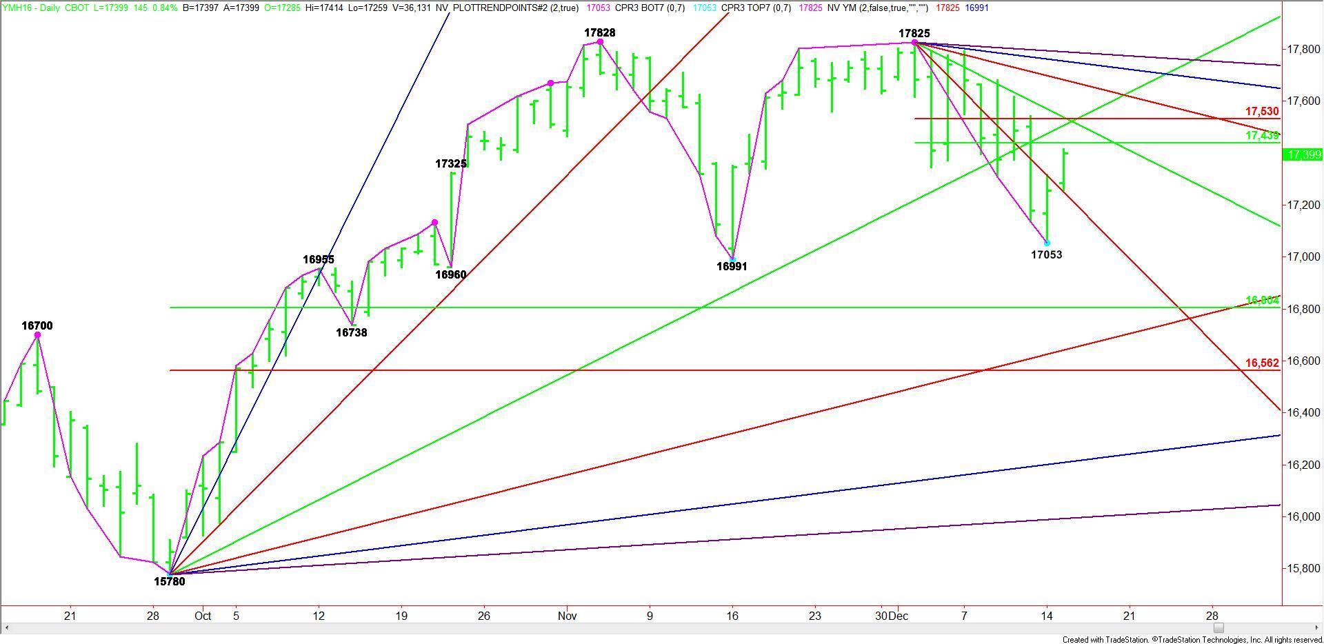 Based on the early price action, the direction of the market today is likely to be determined by trader reaction to the downtrending angle at 17249 and the short-term 50% level at 17439.