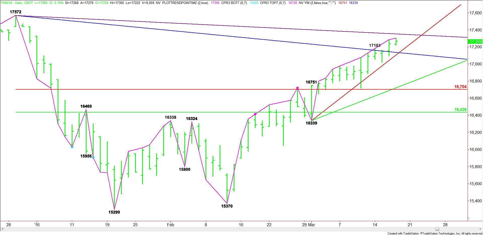 Look for an upside bias as long as the Dow can sustain a rally over 17287. A downside bias and a potential closing price reversal top could develop on a sustained move under this price.