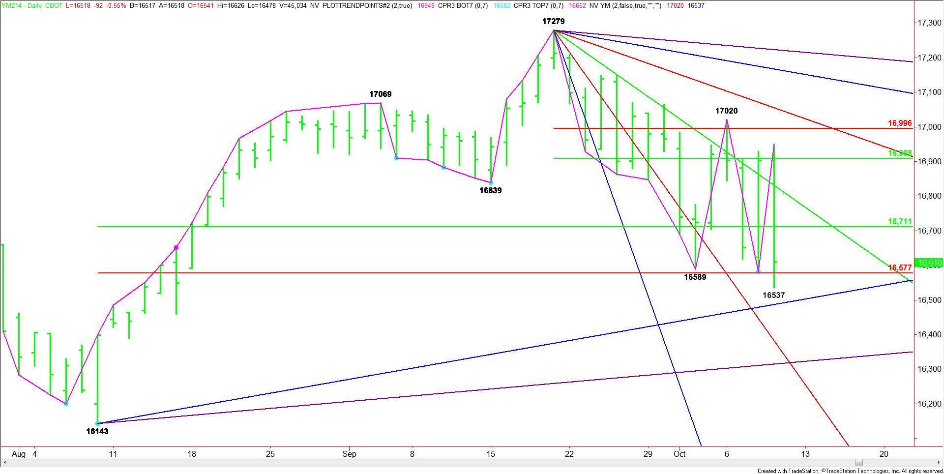The December E-mini Dow Jones Industrial Average futures contract opened steady on Thursday, but buyers couldn’t sustain the move over the major 50% level at 16908. The subsequent break under this level triggered the start of a massive sell-off which lead to a break through the retracement zone support at 16711 to 16577.