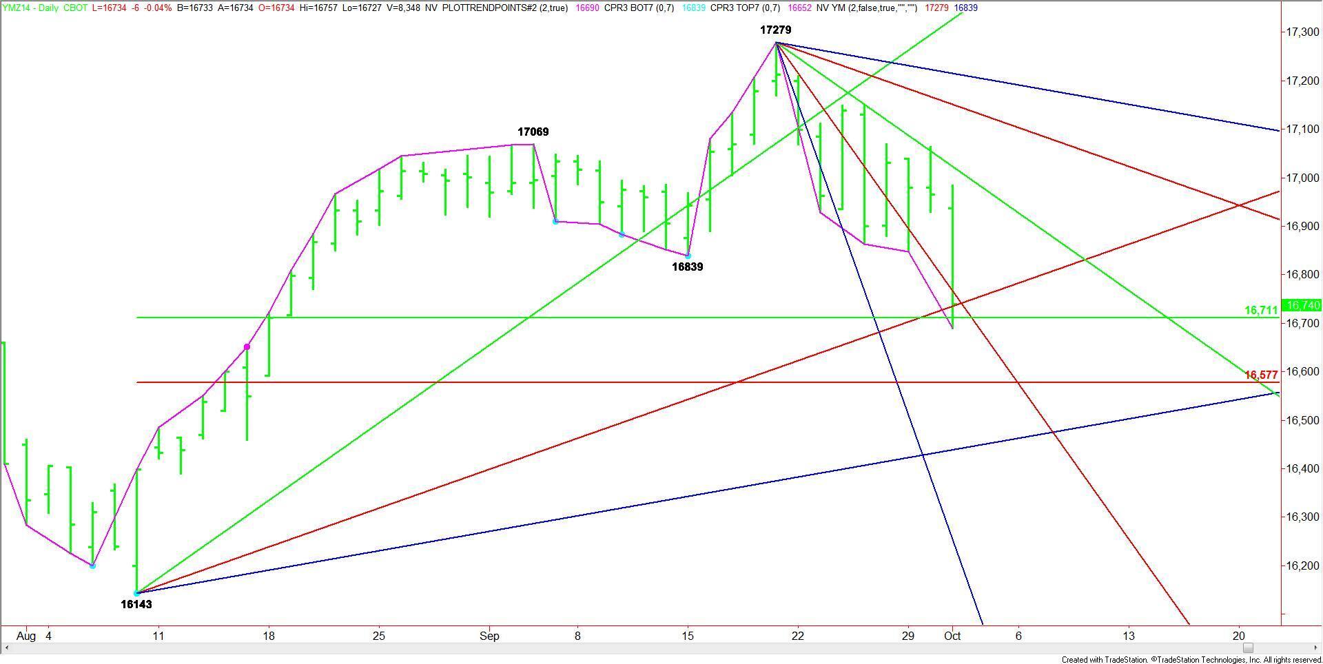 December E-mini Dow Jones Industrial Average futures broke sharply on Wednesday, hitting a major uptrending angle and a 50% retracement level. The close near the low suggests there is enough downside momentum to continue the move, however, if there is no follow-through to the downside, traders have to be prepared for profit-taking or aggressive counter-trend buying.