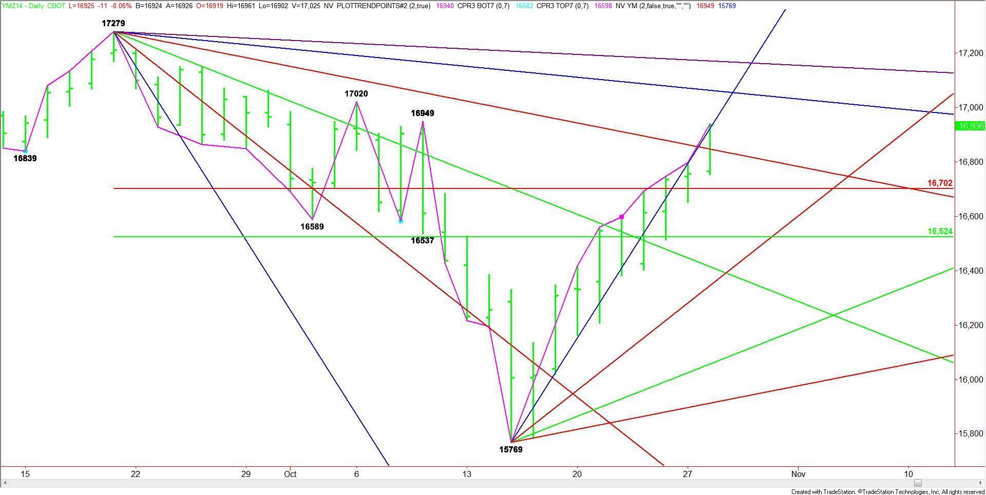 The tone of the market today will be determined by trader reaction to 17049. Since the market is in the window of time for a top and it has been trending into the Fed announcement, don’t be surprised by a closing price reversal top by the end of the day.
