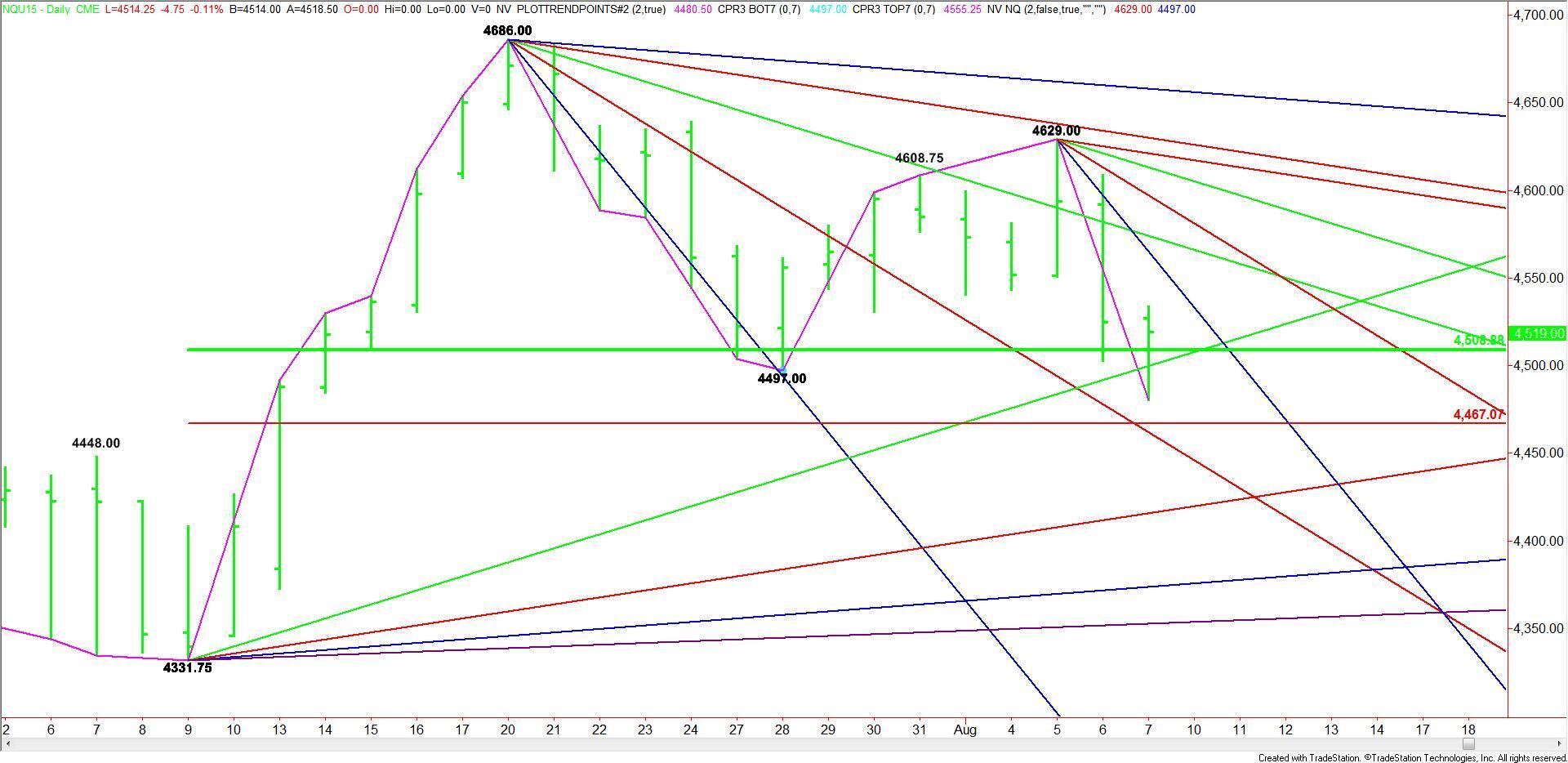 A sustained move under 4507.75 will signal the presence of sellers. The next potential downside target is a Fibonacci level at 4467.00. Crossing to the weak side of a downtrending angle at 4446.00 will put the market in an extremely bearish position with the next target an uptrending angle at 4419.75.
