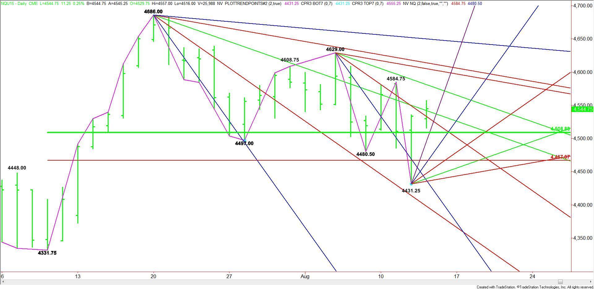 September E-mini NASDAQ-100 Index futures are trading higher shortly before the cash market opening. The main trend is down according to the daily swing chart, but yesterday’s closing price reversal bottom shifted momentum to the upside.