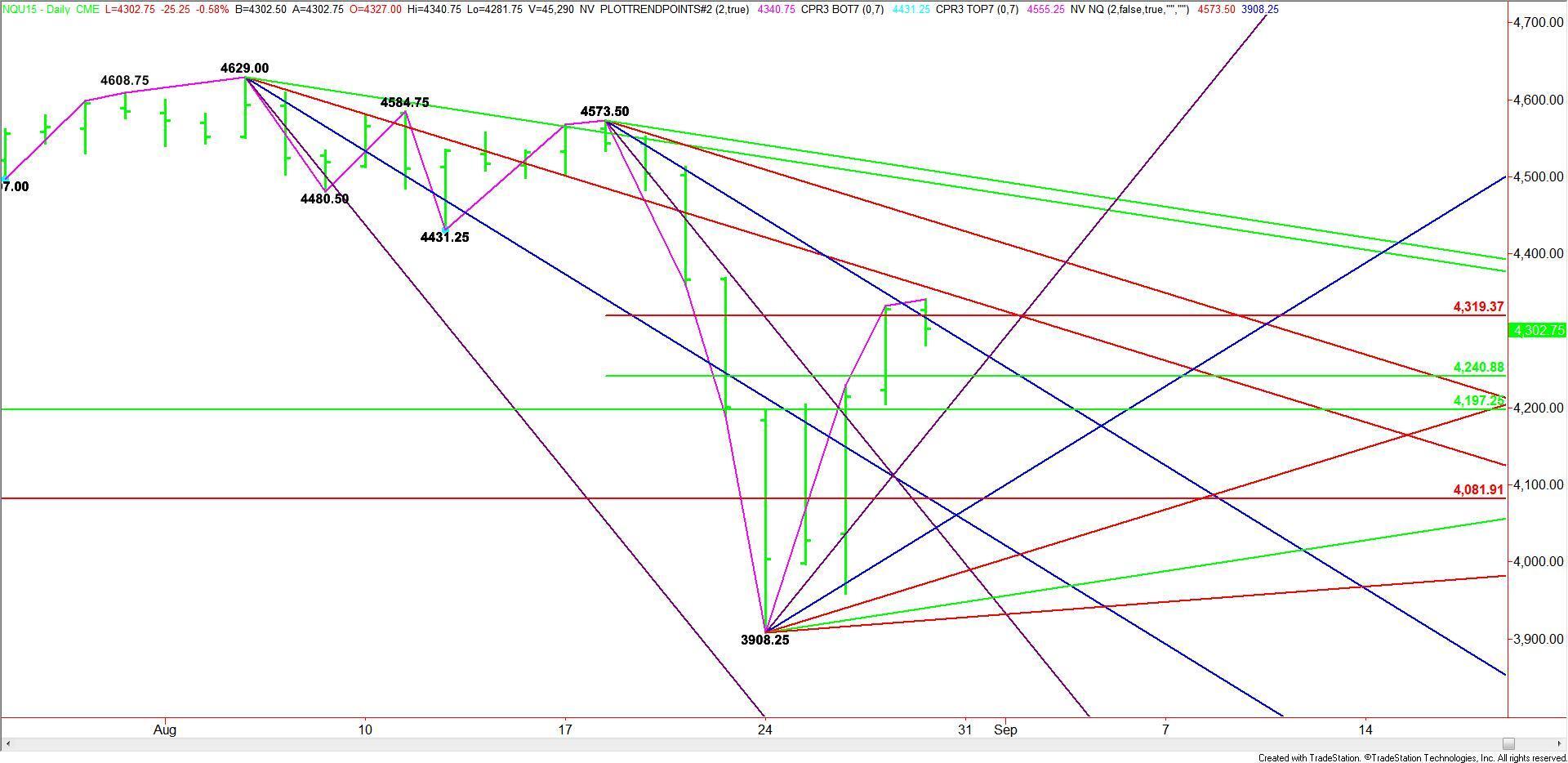The main trend is down according to the daily swing chart. The short-term range is 4573.50 to 3908.25. Its retracement zone is 4240.75 to 4319.50. Earlier in the session, the index tried to breakout over the upper or Fibonacci level at 4319.50, but the move failed.