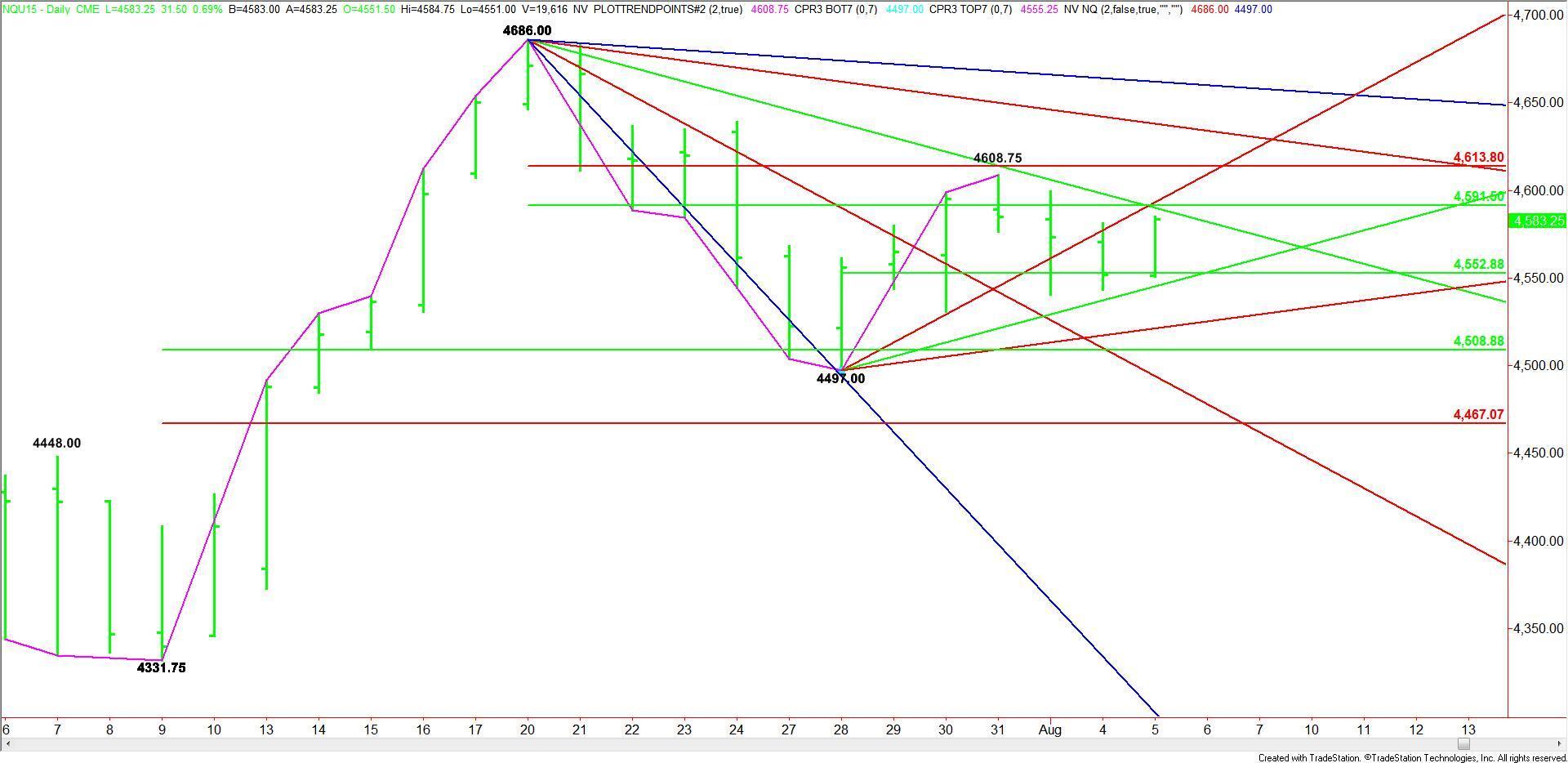 The new short-term range is 4497.00 to 4608.75. Its 50% level or pivot is 4552.75. This price has provided support this week. Trader reaction to this level is likely to set the tone for the day and perhaps the rest of the week.