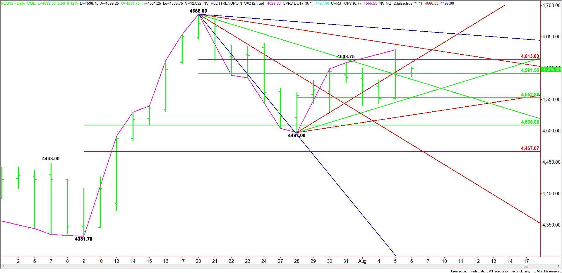The main range is 4686.00 to 4497.00. Its retracement zone at 4591.50 to 4613.75 is currently being tested. The lower or 50% number is currently controlling the direction of the market.