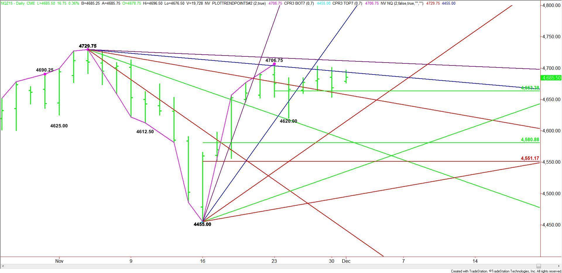 December E-mini NASDAQ-100 Index futures are trading higher shortly before the cash market opening. The index is currently straddling a resistance angle, putting it in a position to challenge the closing price reversal top at 4706.75 and the November high at 4729.75.