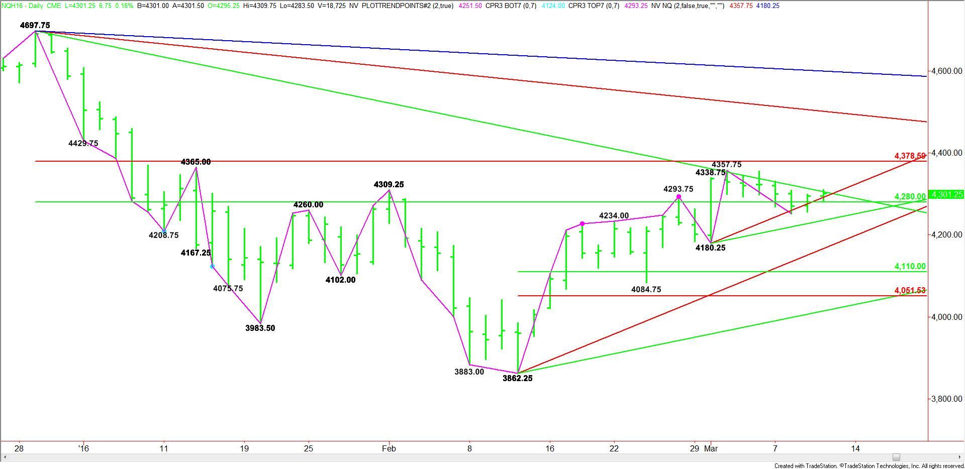 March E-mini NASDAQ-100 Index futures are trading slightly higher shortly before the ECB stimulus announcement and the cash market opening. The market is currently trading at the apex of a small triangle chart pattern. This indicates impending volatility so investors should prepare for an expanded range after several days of consolidation.