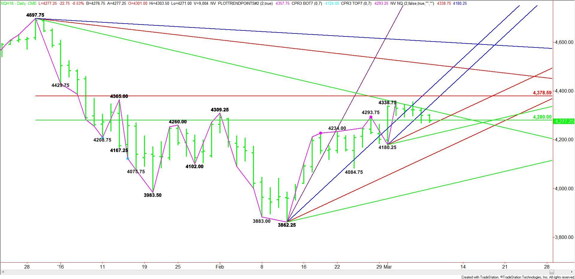 The main range is 4697.75 to 3862.25. Its retracement zone is 4280.00 to 4378.75. This zone appears to be controlling the longer-term direction of the market. Currently, the index is straddling the lower, or 50% level of the range. Trader reaction to this level will determine the direction of the market today.