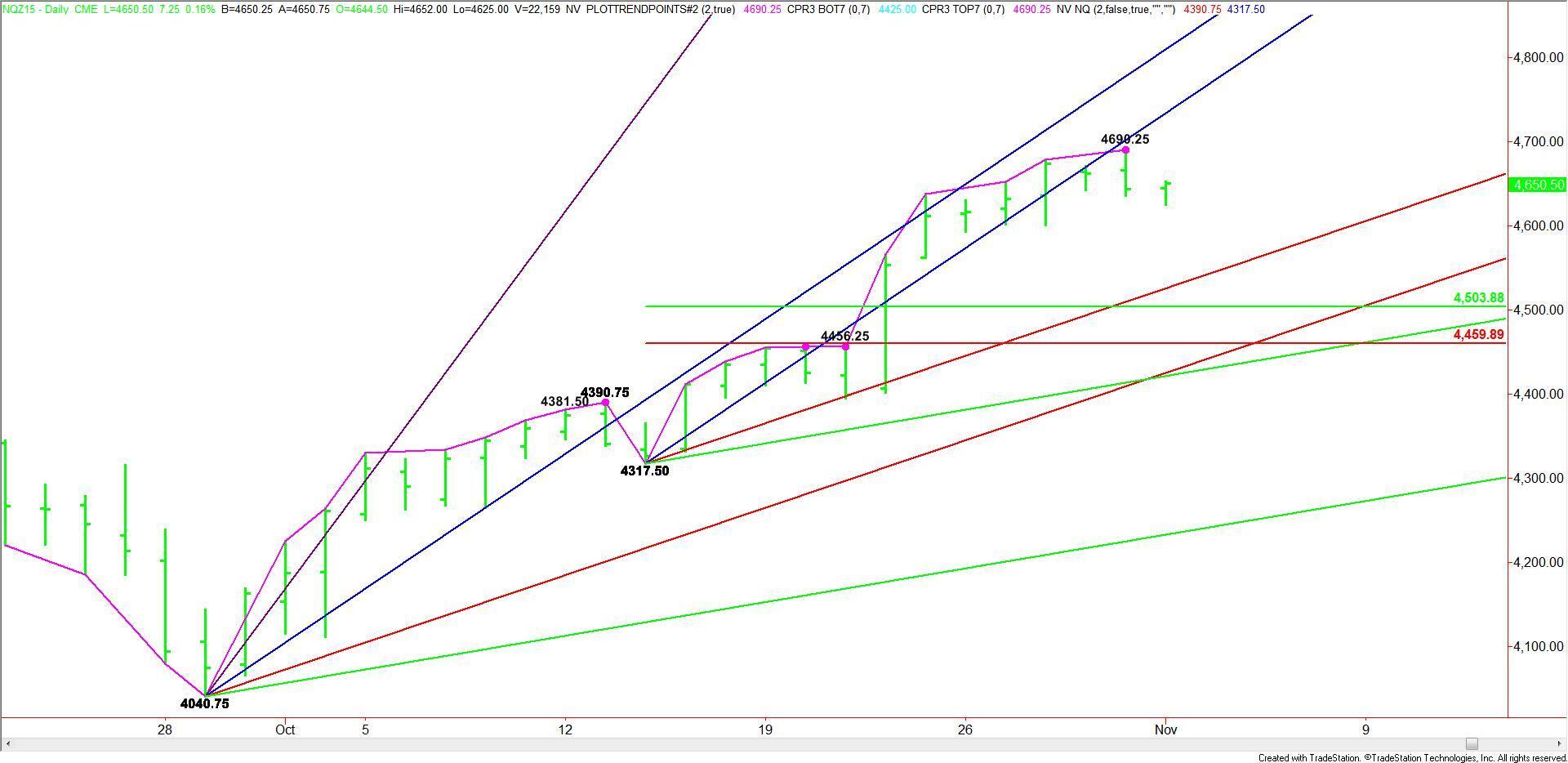 December E-mini NASDAQ-100 Index futures posted a potentially bearish closing price reversal top on Friday. This chart pattern doesn’t mean the trend is getting ready to turn lower, but it could lead to the start of a 2 to 3 day correction.