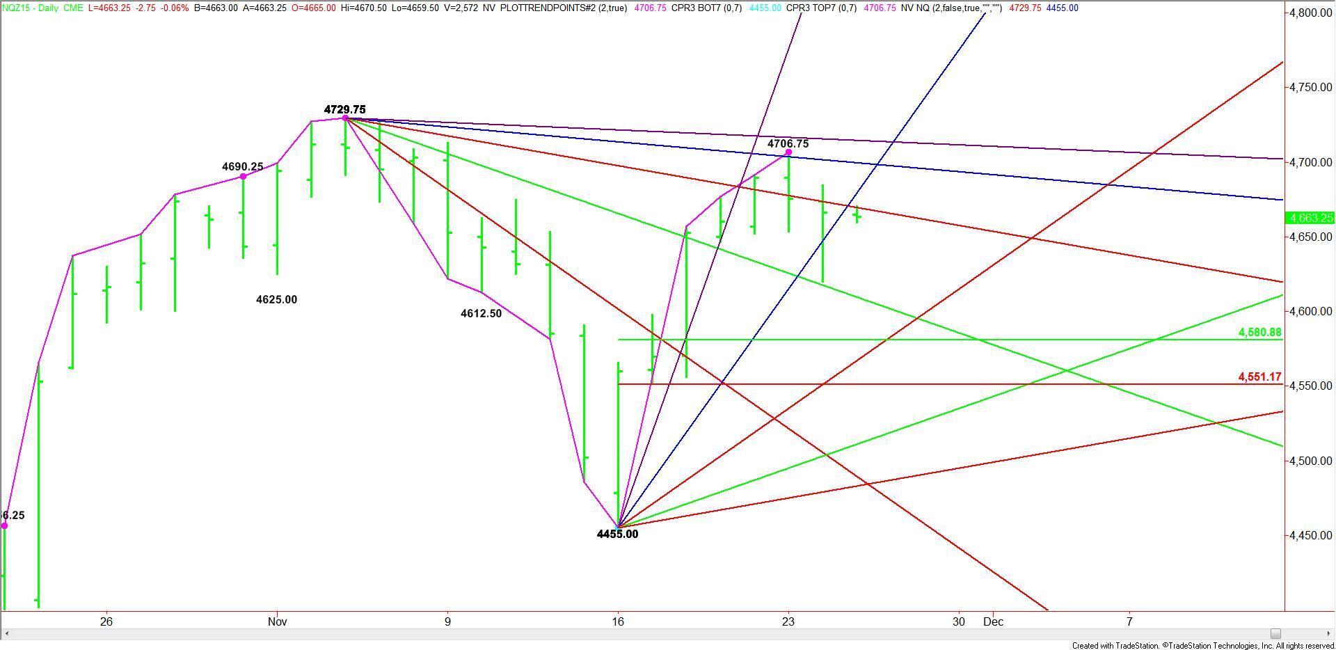The main trend is up according to the daily swing chart. However, momentum may have shifted to the downside with the formation of the closing price reversal top on November 23. If enough selling pressure is present then we could see a 2 to 3 day retracement of the recent rally from 4455.00 to 4706.75.