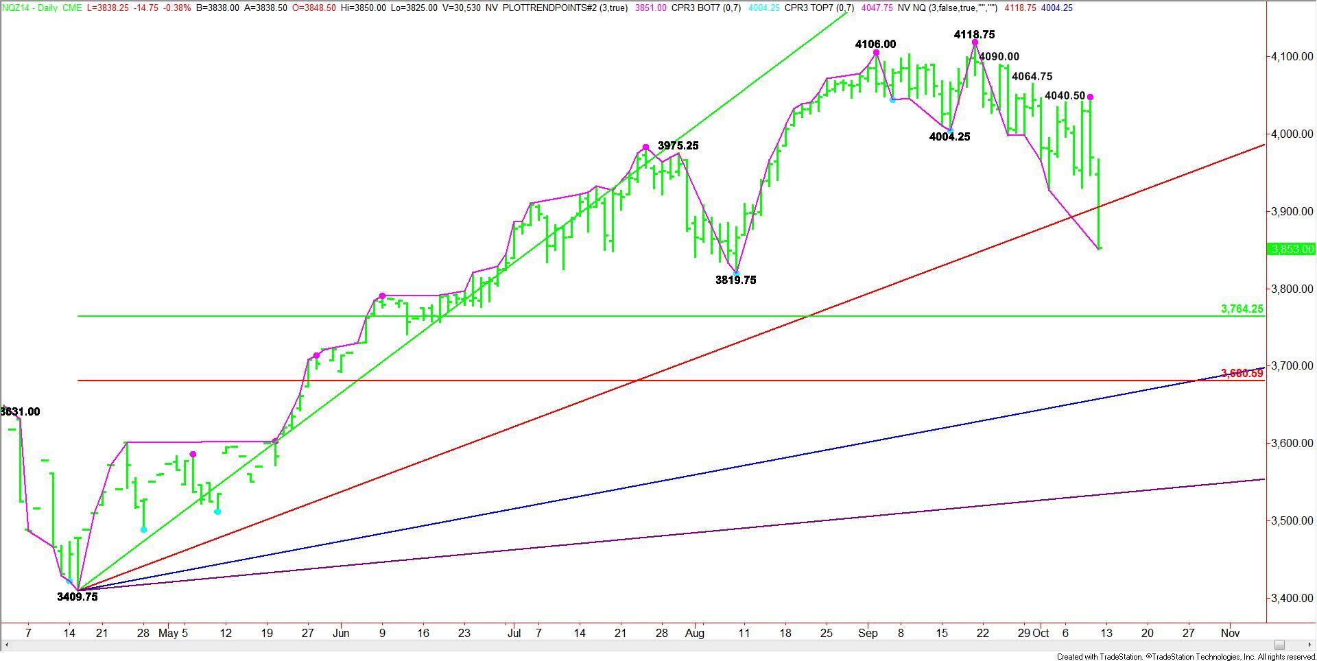 December E-mini NASDAQ-100 Index futures closed on the weak side of a long-term uptrending angle on Friday, setting up the market for further downside action on Monday. This angle comes in at 3905.75. Regaining this angle will indicate short-covering.