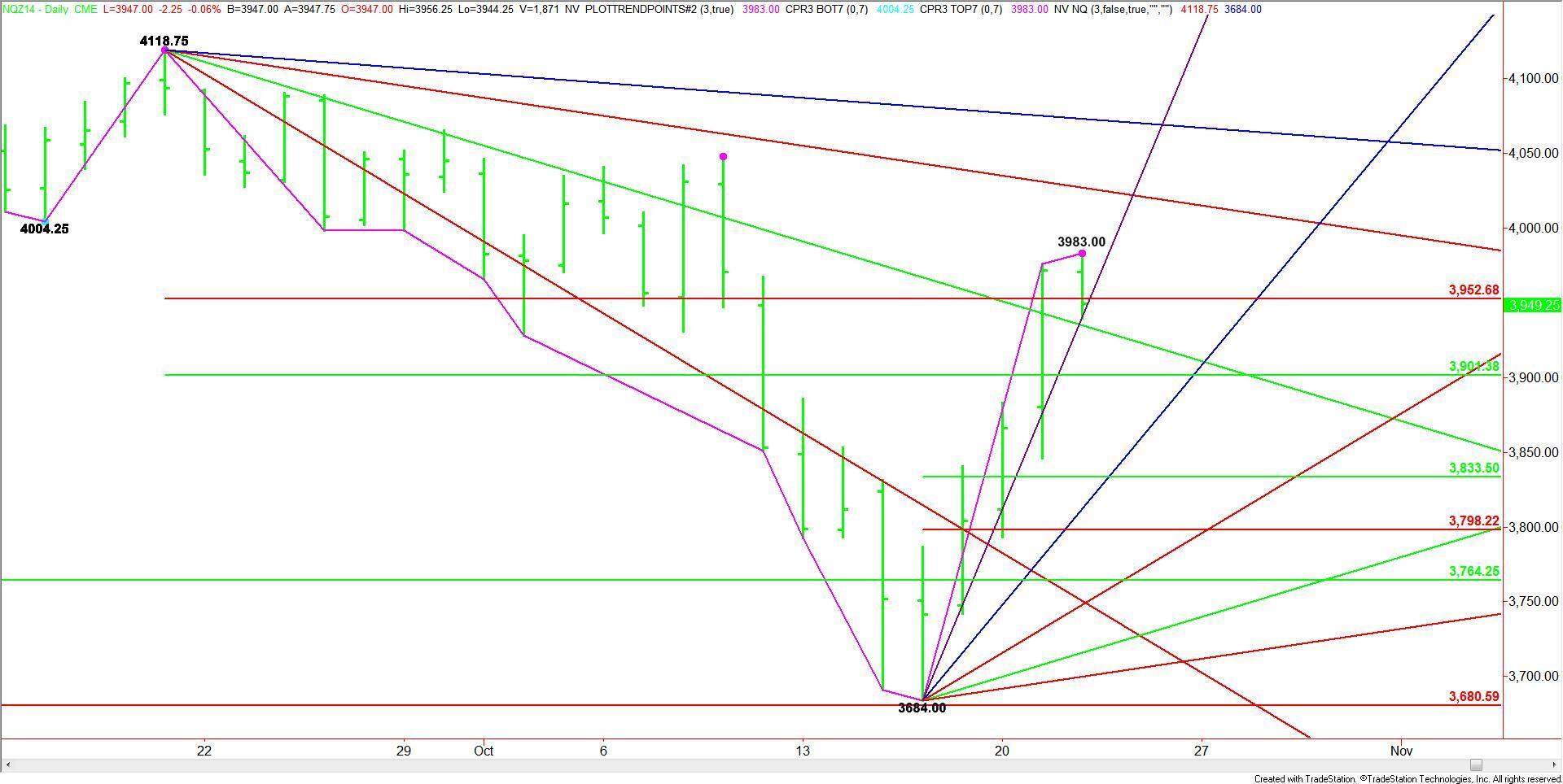 The rally by the December E-mini NASDAQ-100 Index futures market failed at 3983.00, forming a potentially bearish closing price reversal top. A trade through 3939.50 will confirm the chart pattern. The new range is 3684.00 to 3983.00. This makes its retracement zone at 3833.50 to 3798.25 the primary downside target.