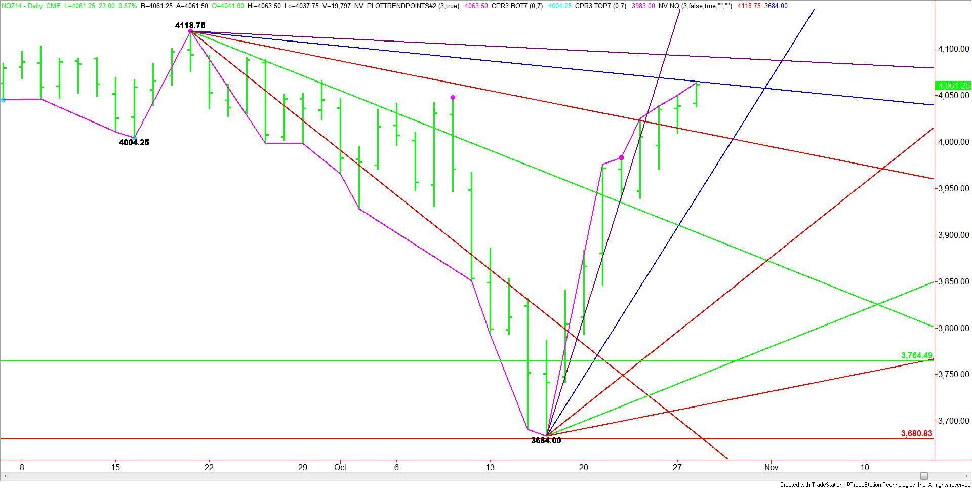 The first resistance angle to overcome drops in at 4062.75. This is followed by another angle at 4090.75. This angle is the last resistance before the September 19 contract high at 4118.75.