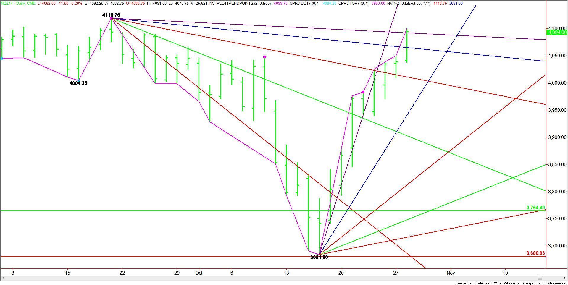 December E-mini NASDAQ-100 Index futures closed on its high at 4094.00, putting the index in a position to continue its eight day rally today. Despite the bullish close, the index is in the window of time to produce a potentially bearish closing price reversal top so long investors should have an exit strategy and aggressive counter-trend traders should start to watch for topping signals on the intraday charts.