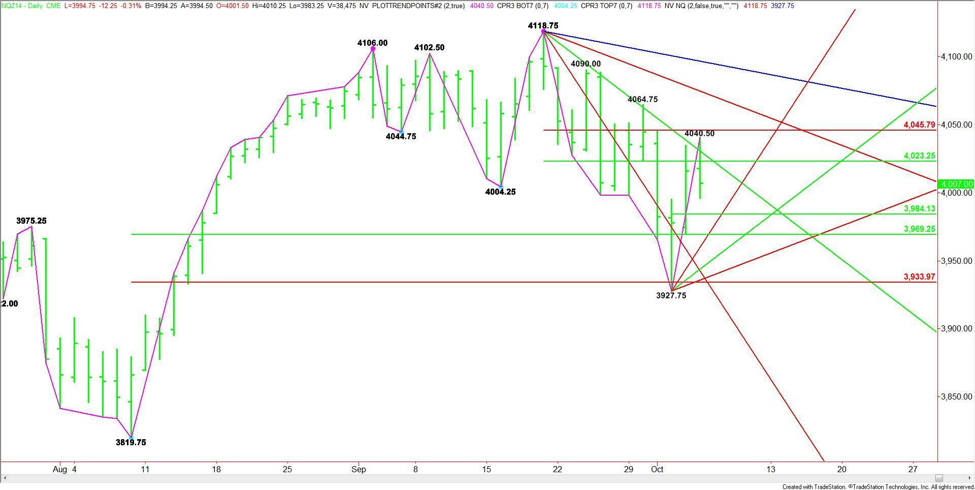 December E-mini NASDAQ-100 Index futures rallied early on Monday, but ran into selling pressure inside a retracement zone at 4023.25 to 4045.75. The close