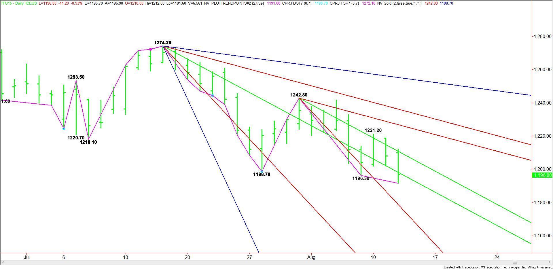 The direction of the market today is likely to be determined by trader reaction to the angle at 1198.20. A sustained move under this angle will signal the presence of sellers. This could create enough downside momentum to trigger an eventual break into a steep downtrending angle at 1178.80. Crossing to the weak side of this angle will put the index in an extremely weak position.