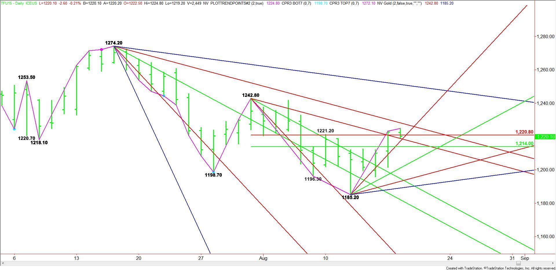 A break under the Fib level at 1220.80 will signal the presence of sellers. The next downside target is a pair of angles at 1218.80 and 1217.20. Crossing to the bearish side of the angle at 1217.20 will put the market in a weak position with the next target coming in at 1214.00.