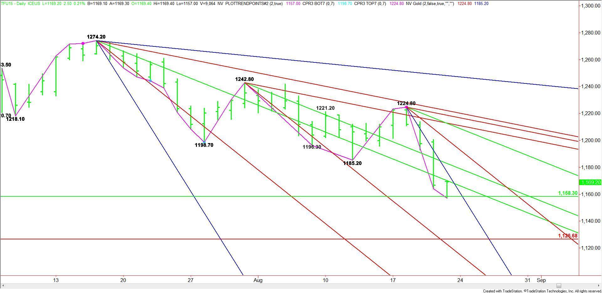 Watch the price action and read the order flow at 1158.30. This will tell us whether the bulls or the bears are in control. A sustained move under this price could trigger a steep break into 1126.70. A sustained move over 1158.30 could lead to a labored rally because of the number of potential resistance targets.