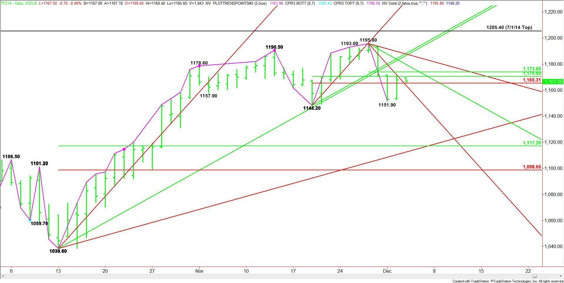 Today’s opening is expected to be on the strong side of a downtrending angle at 1163.80. The next angle drops in at 1179.80. This will be reached if buyers can take out the 50% level at 1173.90.