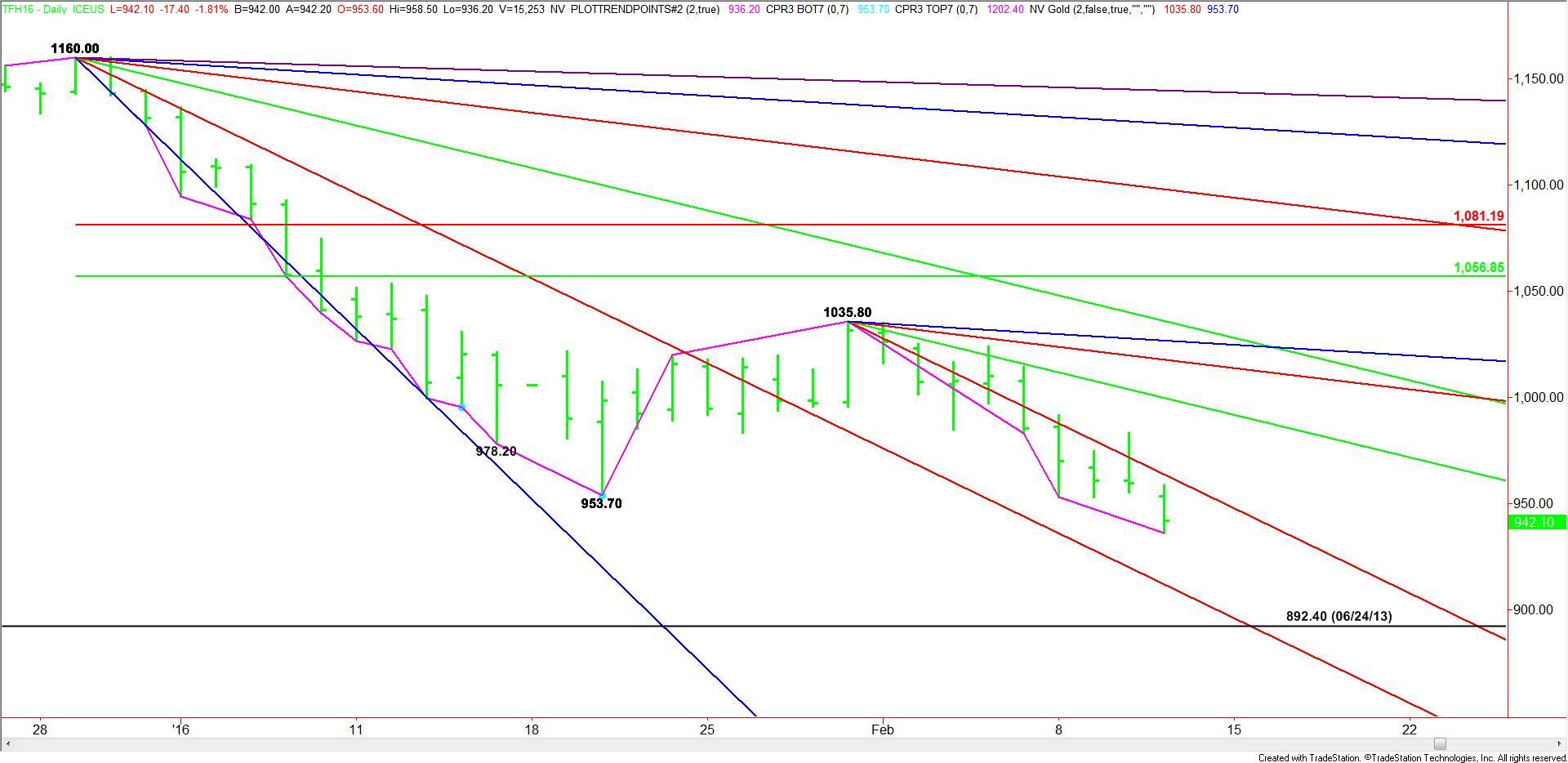 March E-mini Russell 2000 Index futures are called sharply lower. Today’s early session sell-off into 936.20 reaffirmed the downtrend. Today is the ninth day down from the 1035.80 main top. This puts the market in the window of time to form a potentially bullish closing price reversal bottom.