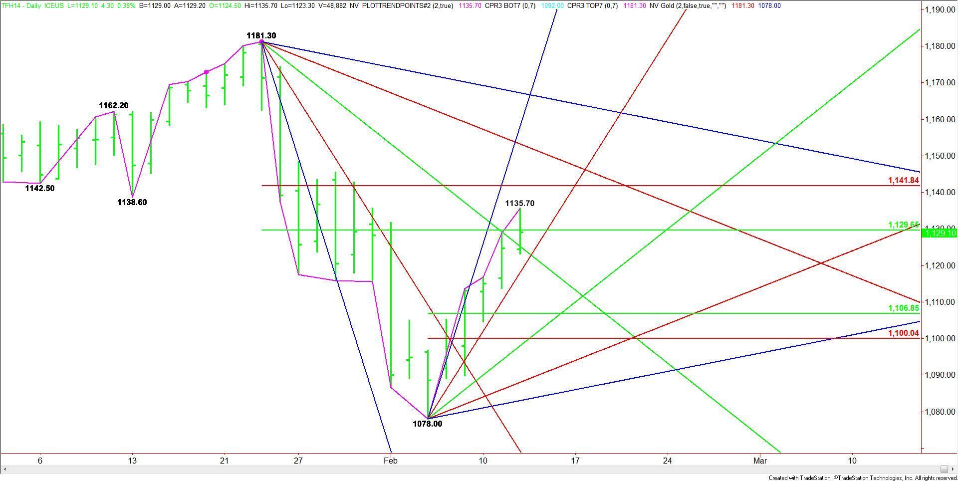 Technically, the main trend is down on the daily chart. The main range is 1181.30 to 1078.00. This makes the retracement zone at 1129.70 to 1141.90 a possible selling zone. Certainly counter-trend buyers will look at this zone as a potential area to begin taking profits. Aggressive short-sellers may decide to refresh their positions inside this zone. Either way, it is an important area to watch.