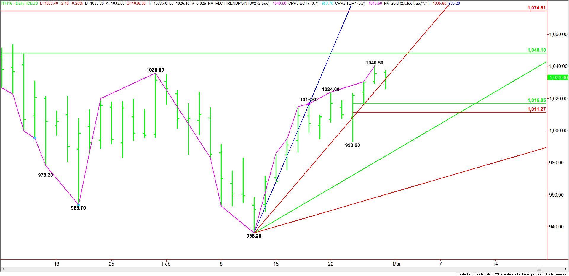 Based on the close at 1035.50 and the earlier price action, the direction of the market today is likely to be determined by trader reaction to the steep uptrending angle at 1032.20.