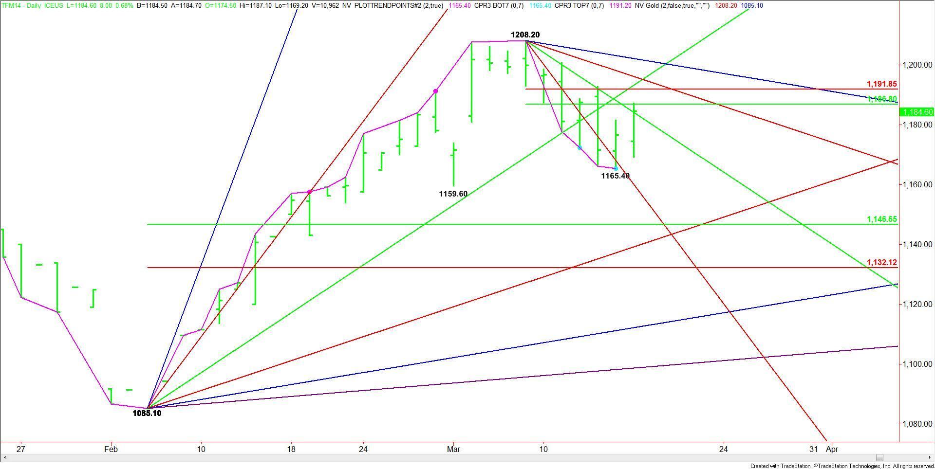 A major uptrending angle, moving up 4 points per day from the 1985.10 bottom, is at 1193.10. Crossing over to the bullish side of this angle will put the market in a very strong position and could trigger an eventual test of the contract high at 1208.20.