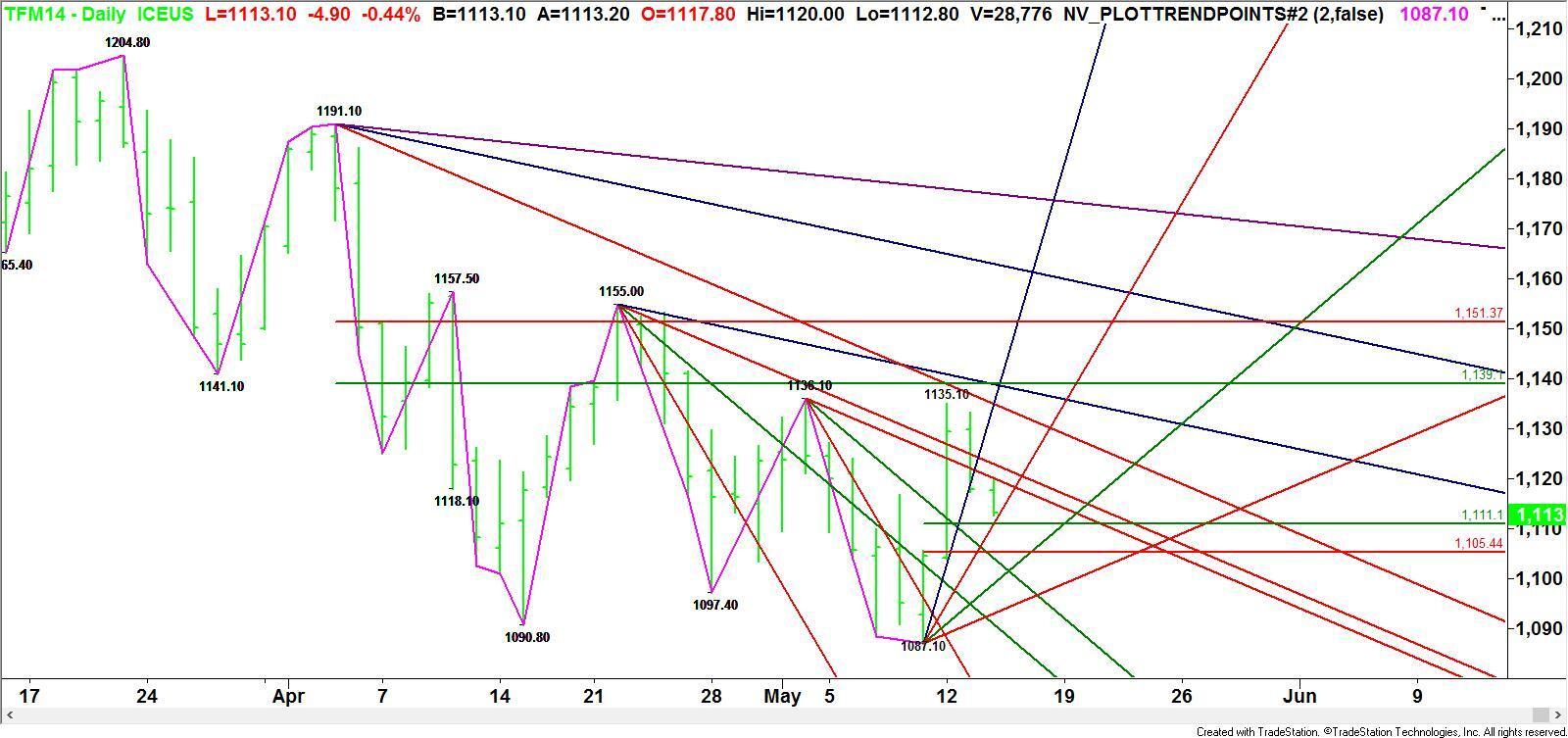 The main trend is down on the daily chart. The main trend will turn up when 1136.10 is taken out. The new short-term range is 1087.10 to 1135.10, making its retracement zone at 1111.10 to 1105.40 the next downside target. If the market is going to turn higher, it is likely to start in this zone. Traders should watch the order flow to see if bids big enough to reverse the sell-off begin to show up.