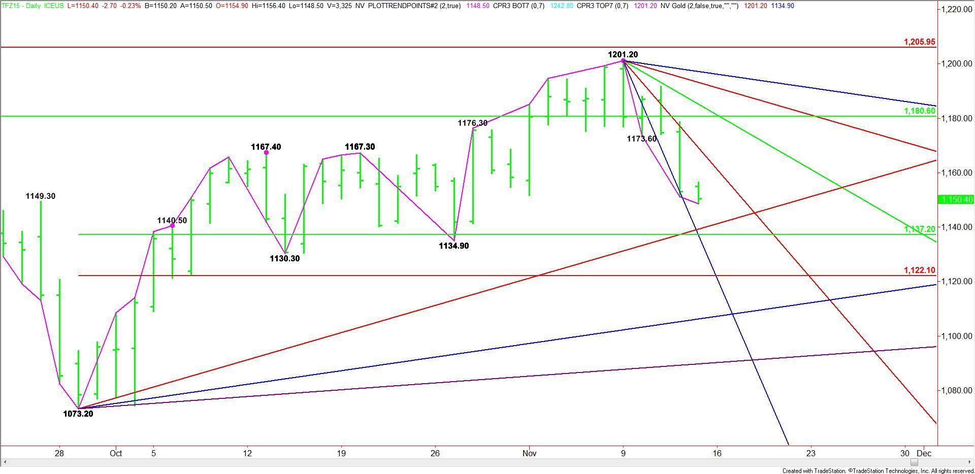 The nearest upside target is a steep downtrending angle at 1169.20. This angle has been guiding the market lower since the 1201.20 top on November 9. This price is likely to act like resistance on the first test, however, it is also a trigger point for a breakout with 1185.20 the next likely target.