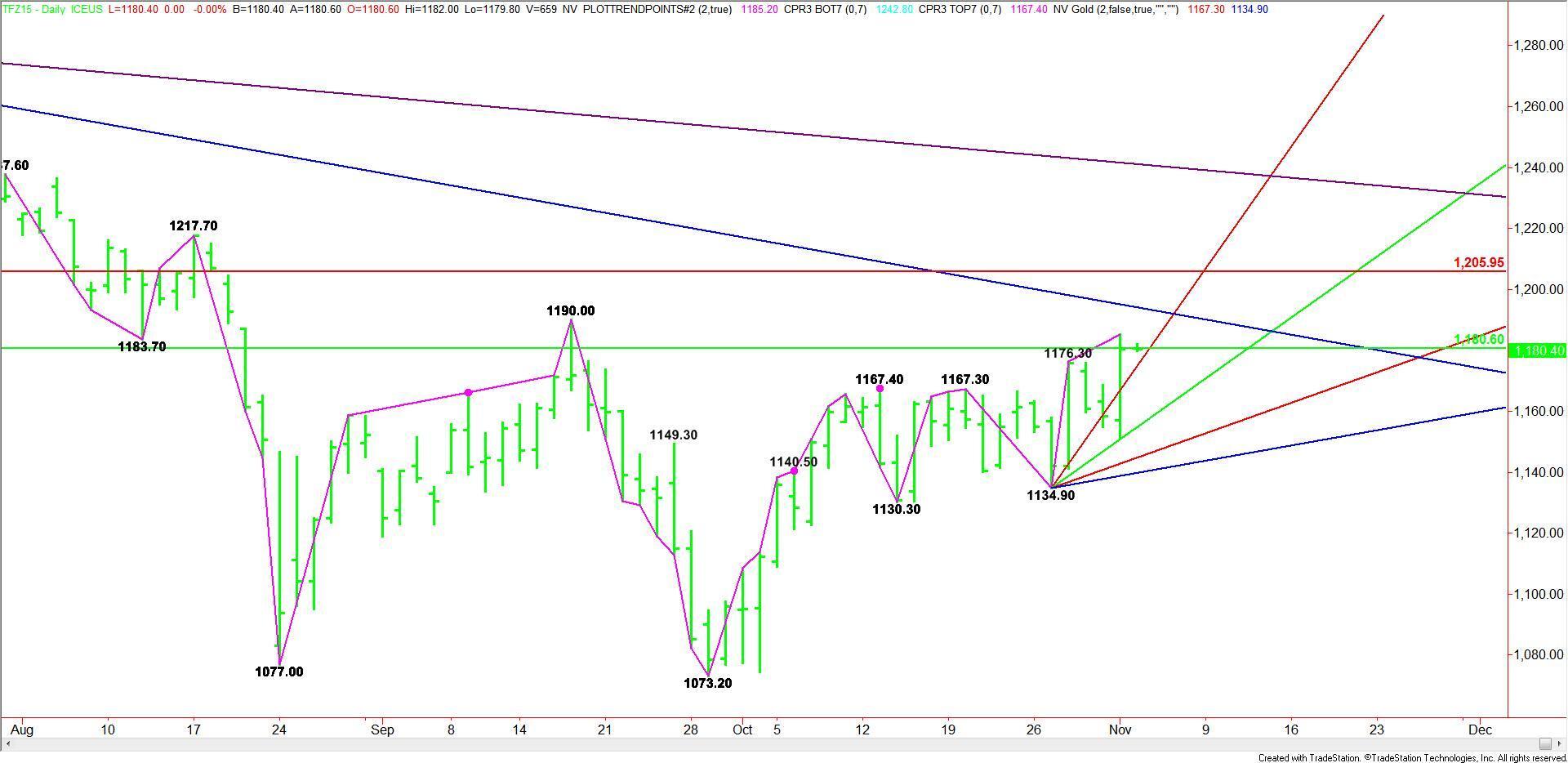 A sustained move over 1180.60 will signal the presence of buyers. The first minor target is yesterday’s high at 1185.20. Taking out this level could trigger a fast move into the September 17 main top at 1190.00. Crossing this level will reaffirm the uptrend.