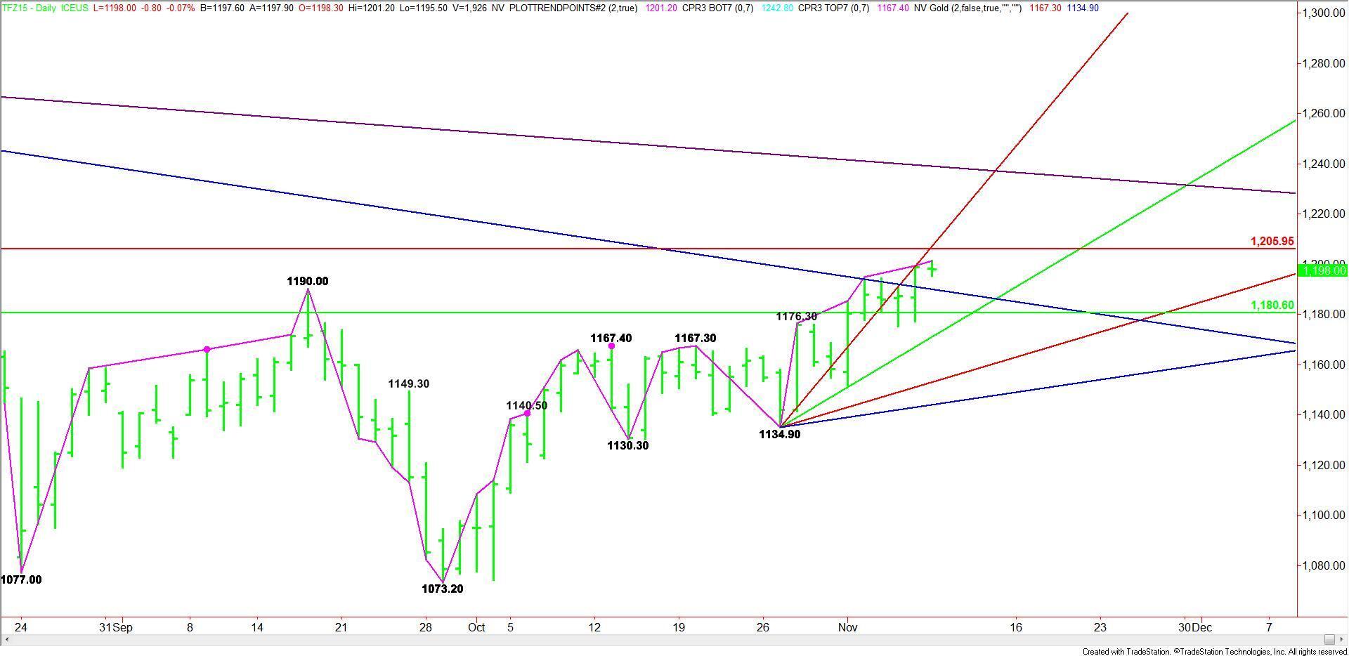 Friday’s close at 1198.80 puts the index in a position to challenge the upper or Fibonacci level at 1206.00. Trader reaction to this level could set the tone for the week.