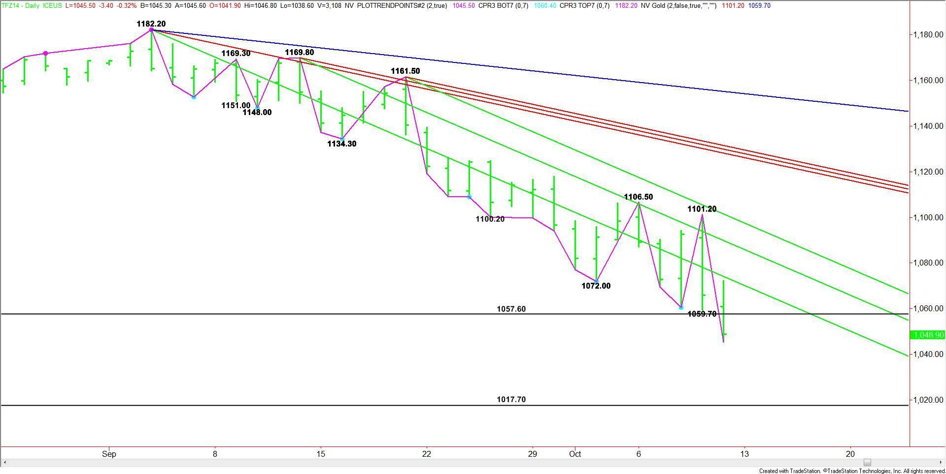 The December E-mini Russell 2000 Index closed on the bearish side of a major bottom at 1057.60. The daily chart indicates there is plenty of room to the downside with 1017.70 the next likely downside target.