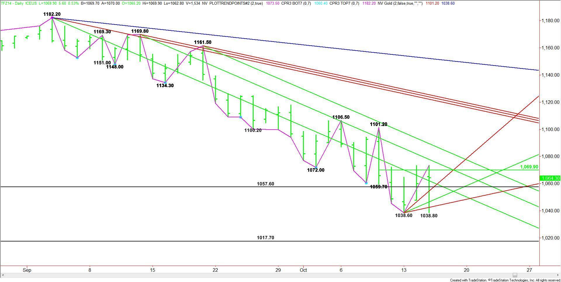 The first thing traders should’ve noticed is buyers came in at 1038.80 on Wednesday to defend the previous main bottom at 1038.60. The rebound from this level was so strong the index closed higher for the session. This may have been a sign that shorts were covering in anticipation of a bottom.
