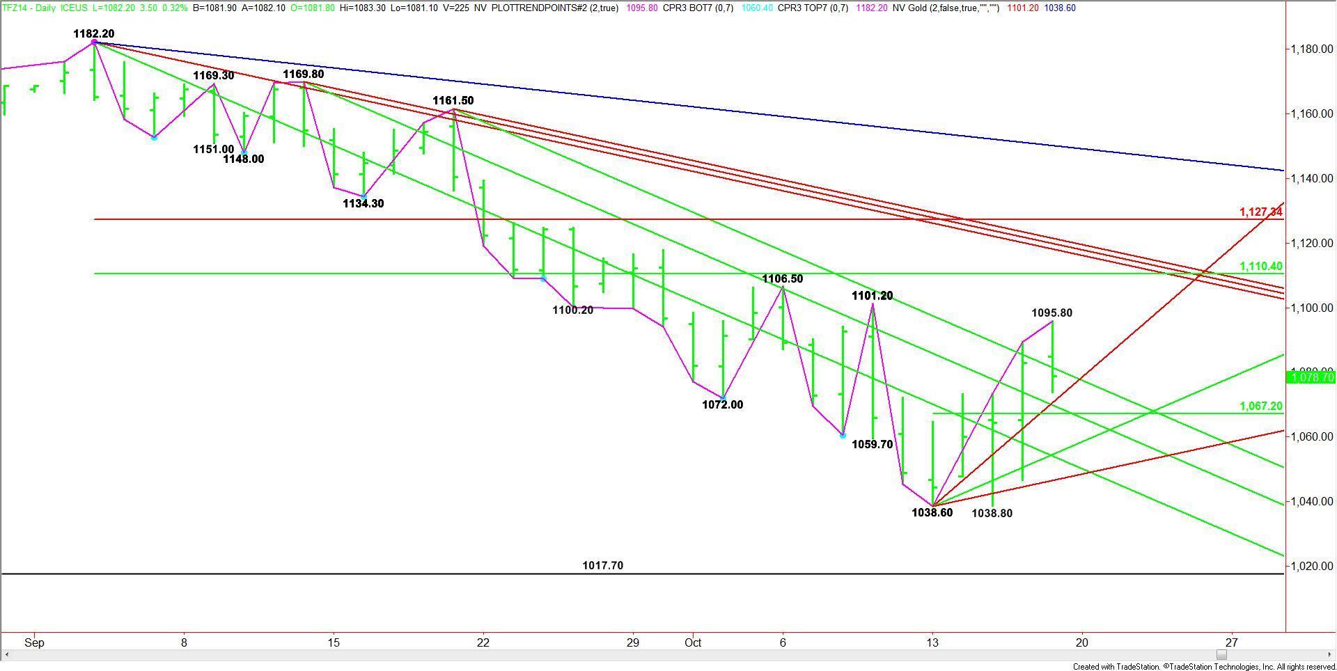 The new short-term range is 1038.60 to 1095.80. The pivot price created by this range at 1067.20 is controlling the short-term direction of the market. Trader reaction to this angle will set the tone for the day.