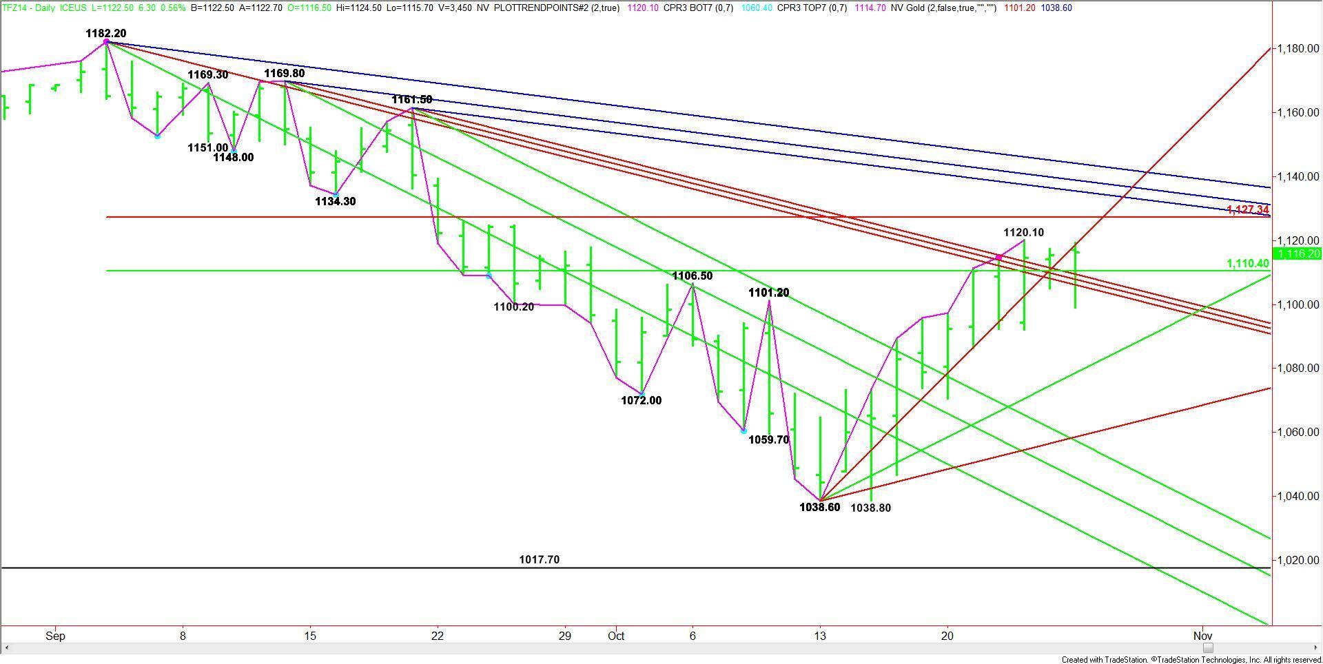 The main range is 1182.20 to 1038.60. The retracement zone formed by this range at 1110.40 to 1127.30 is currently being tested. Last week’s high at 1120.10 fell inside this range, indicating the presence of sellers.