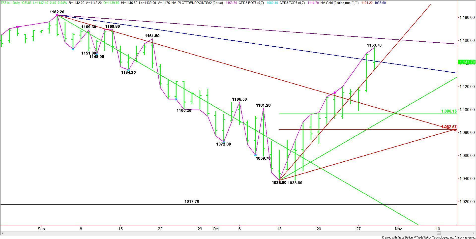 December E-mini Russell 2000 Index futures rallied to 1153.70 on Wednesday before closing lower. This is a potentially bearish chart pattern, but it would
