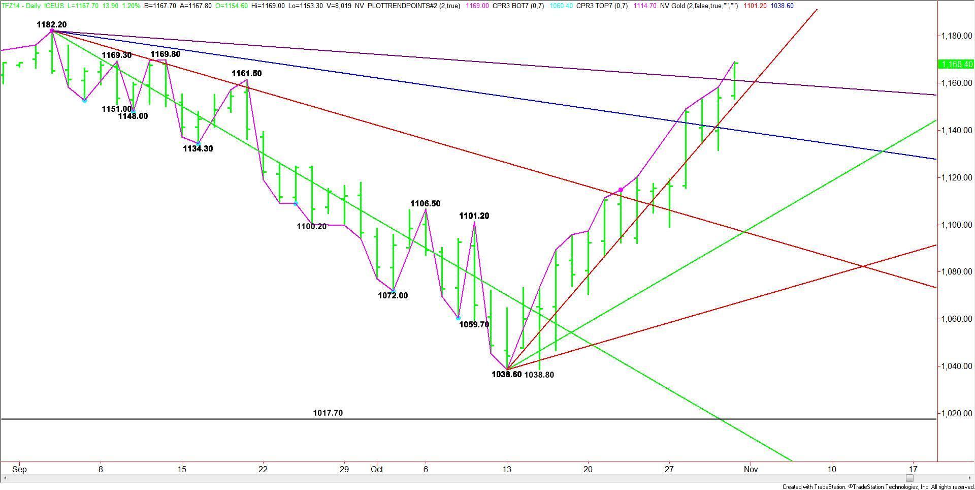 The daily chart opens up to the downside under 1140.20 with the next major support coming in way down at 1094.60.