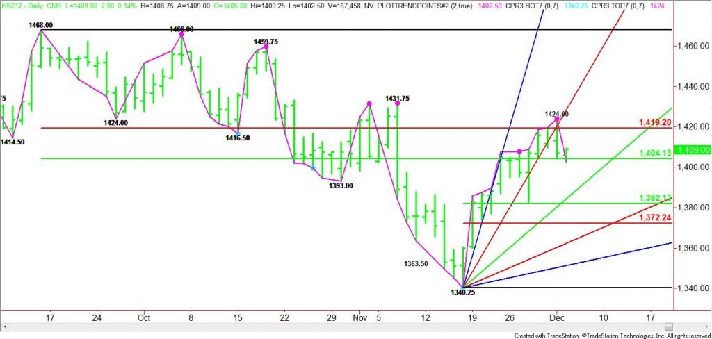 The current rally from 1340.25 to 1424.00 has created a retracement zone at 1382.25 to 1372.25. This area is the potential downside target. Since the chart pattern typically triggers a 2 to 3 day break, it is possible that the December E-mini S&P 500 is setting up for a near-term break of at least 41.75 points.