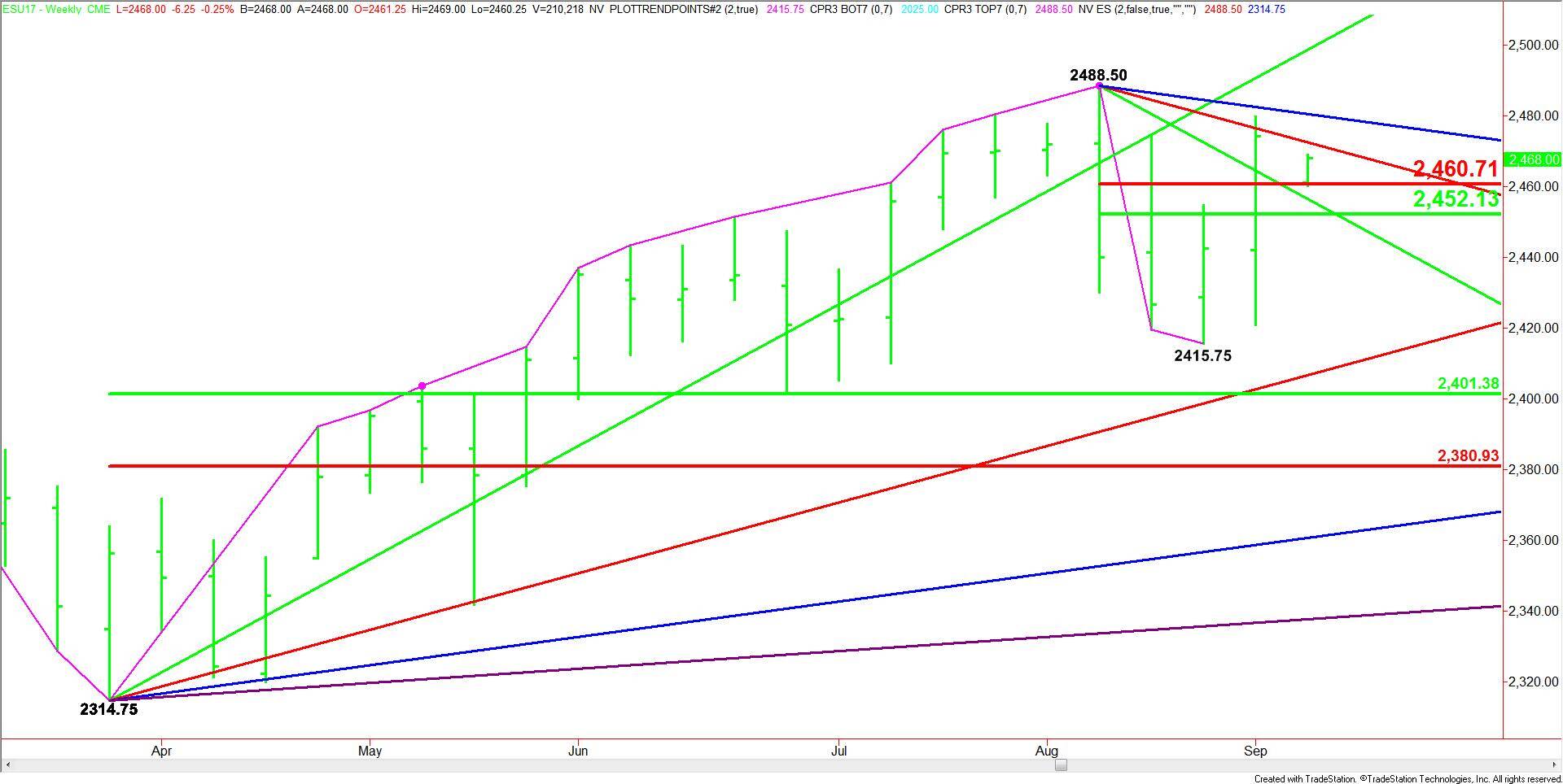 The main trend is up according to the weekly swing chart. Momentum has also shifted back to the upside. A trade through 2488.50 will signal a resumption of the uptrend. A move through 2415.75 will shift momentum back to the downside.