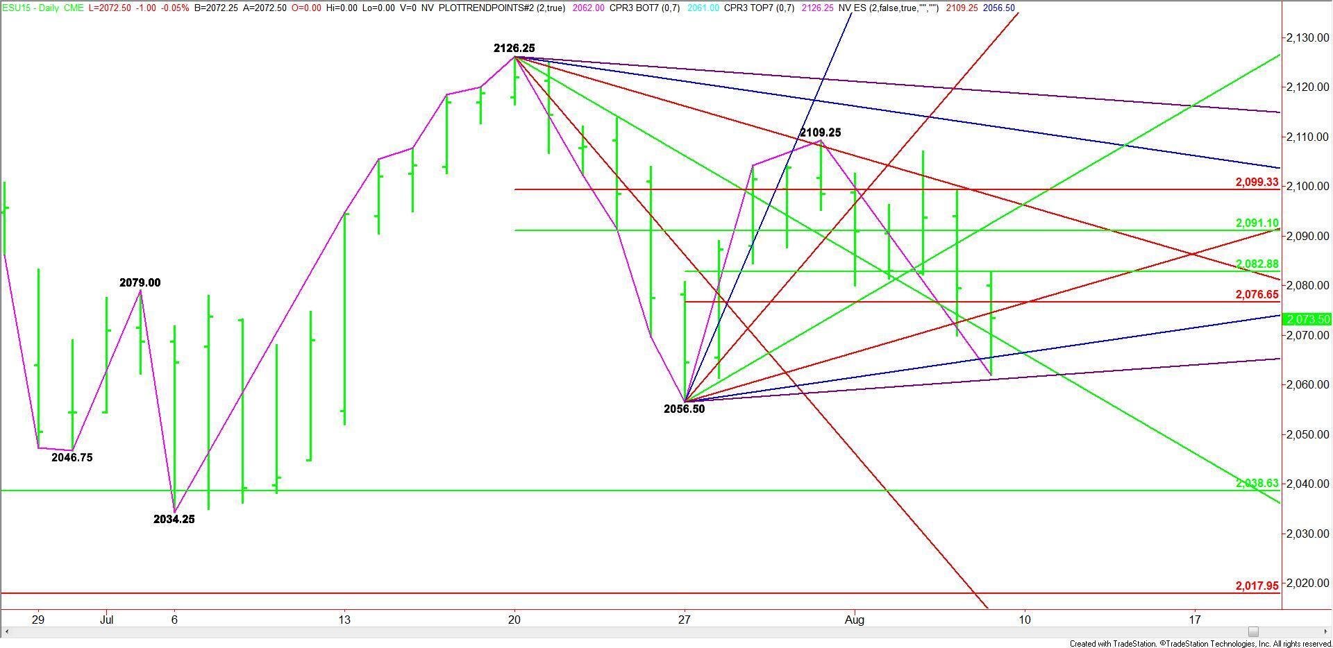 September E-mini S&P 500 Index futures closed lower on Friday and for the week. The price action suggests investor indecision. Investors are looking for guidance as to the timing of the first Fed interest rate hike since 2006. Since the Fed decision is data dependent, the index may be more sensitive to economic reports until the next Fed meeting in mid-September.