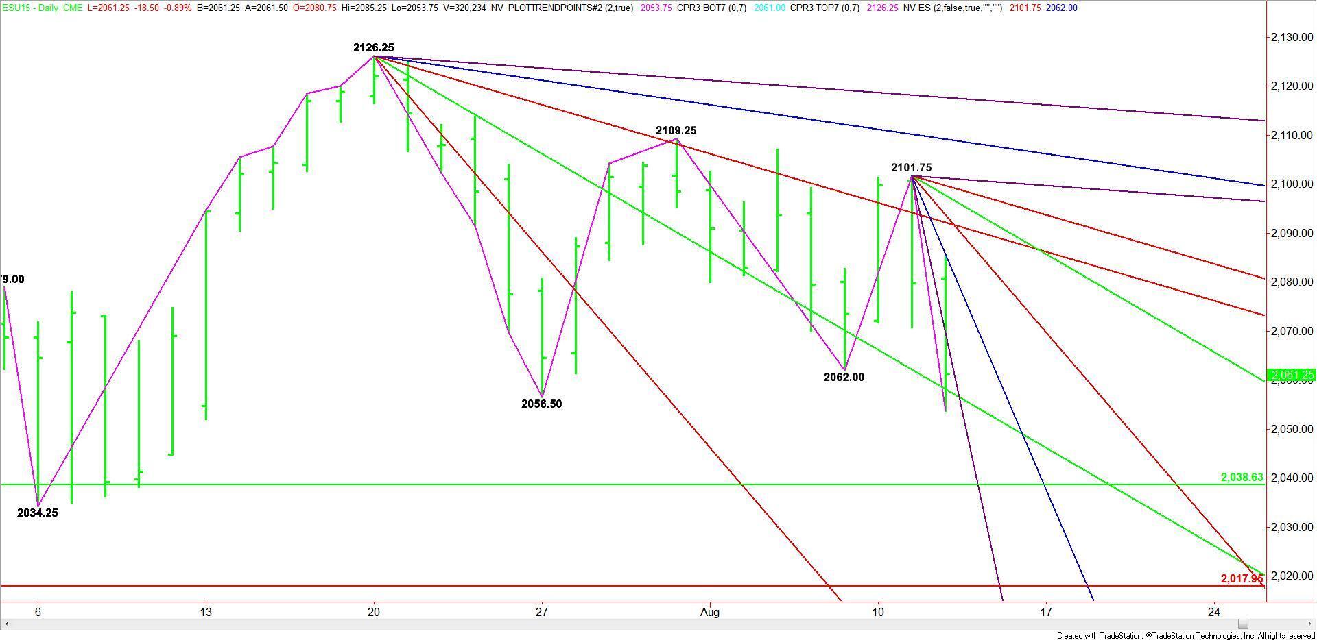 September E-mini S&P 500 Index futures plunged during the pre-market session after China devalued its currency for a second straight day. The trade through 2062.00 turned the main trend to down on the daily chart. A new main top was formed at 2101.75.
