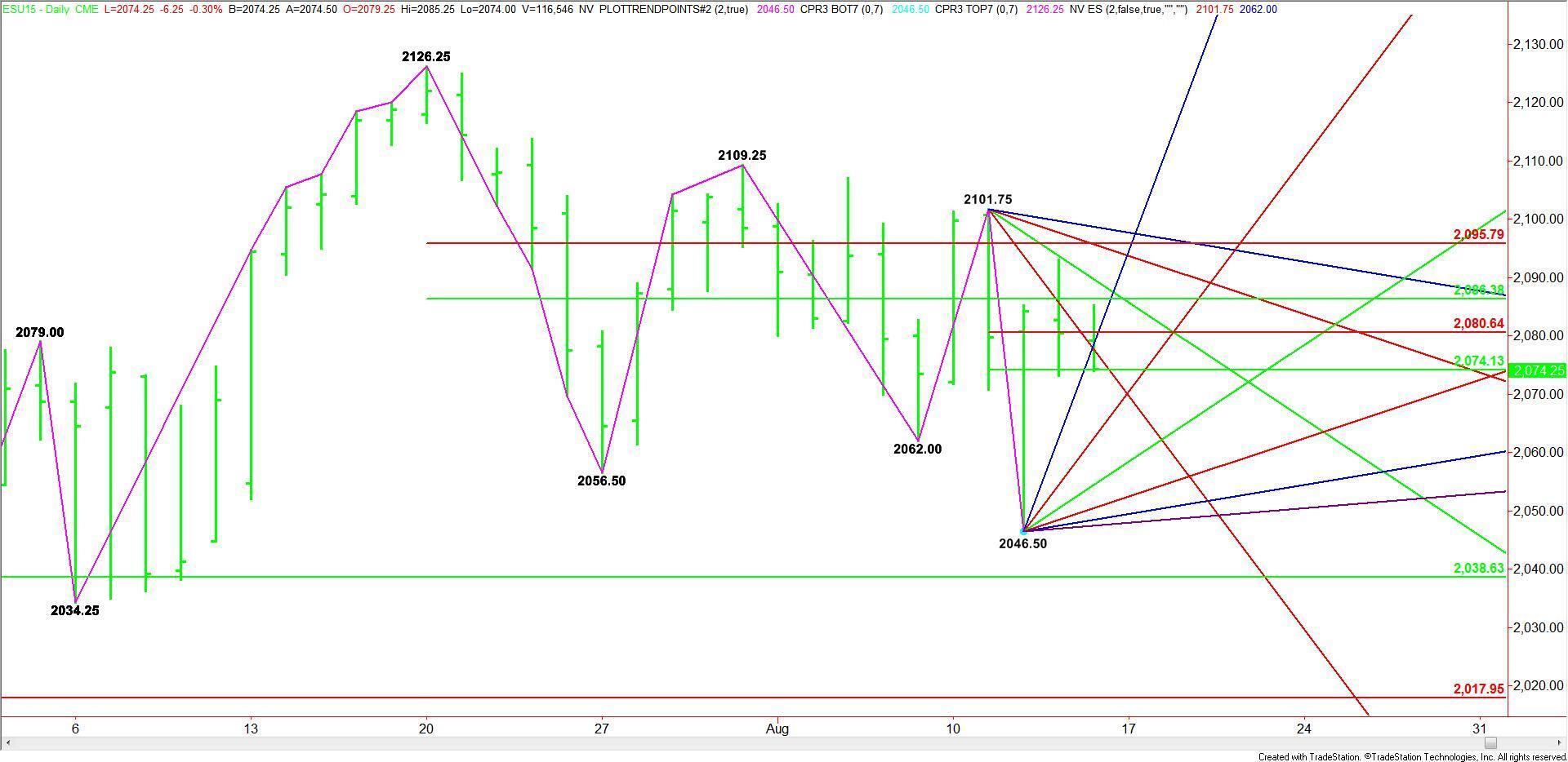 September E-mini S&P 500 Index futures are called flat shortly ahead of the cash market opening. The market is sitting inside a retracement zone, indicating investor indecision. However, the new lower top and lower bottom formed this week at 2101.75 and 2046.50 suggests there is a growing bias to the downside.
