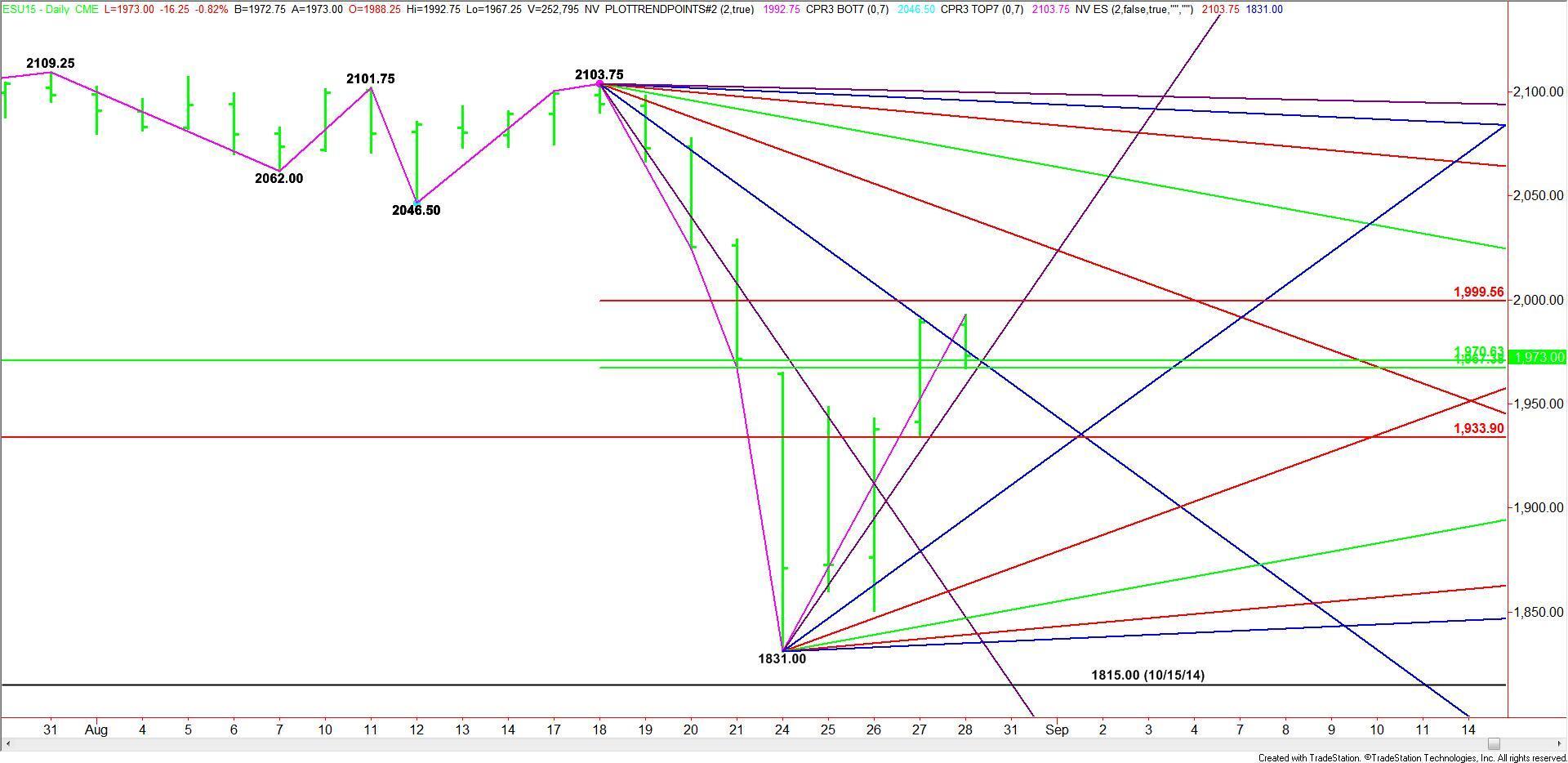 The main trend is down according to the daily swing chart. The main range is 1815.00 to 2126.25. The short-term range is 2103.75 to 1831.00. Its retracement zone is 1967.50 to 1999.50. The key area to watch is the price cluster formed by the two 50% levels at 1967.25 to 1970.50. The pre-market high at 1992.75 fell inside the short-term retracement zone.