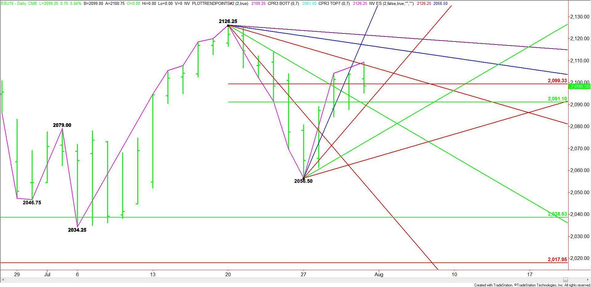 September E-mini S&P 500 Index futures finished lower on Friday after buyers couldn’t hold on to earlier gains. The selling started when the market tested a downtrending angle. The subsequent intraday break has the appearance of a secondary lower top, but this won’t be confirmed until 2095.25 is taken out.