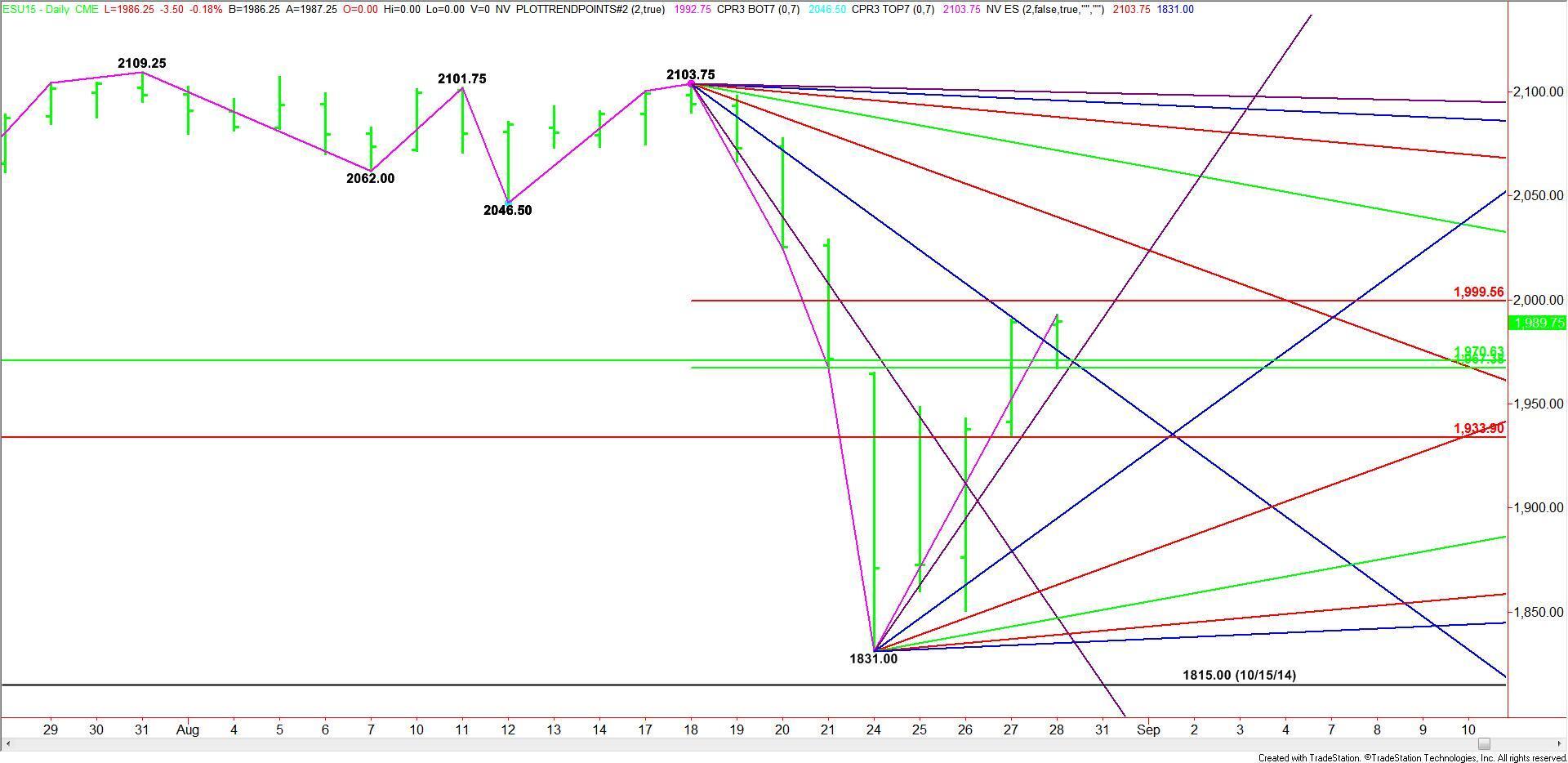 The main trend is down. The main range is 2103.75 to 1831.00. Its retracement zone is 1967.50 to 1999.50. A major 50% level also comes in at 1970.50. Trader reaction to this retracement zone is likely to set the tone for the day and perhaps the week.